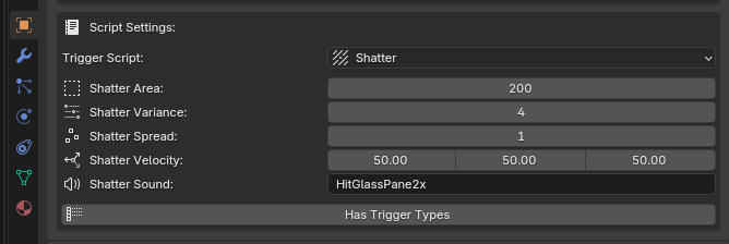 Shatter VarianceUndocumented. Affects density of the shards created when the object shatters.