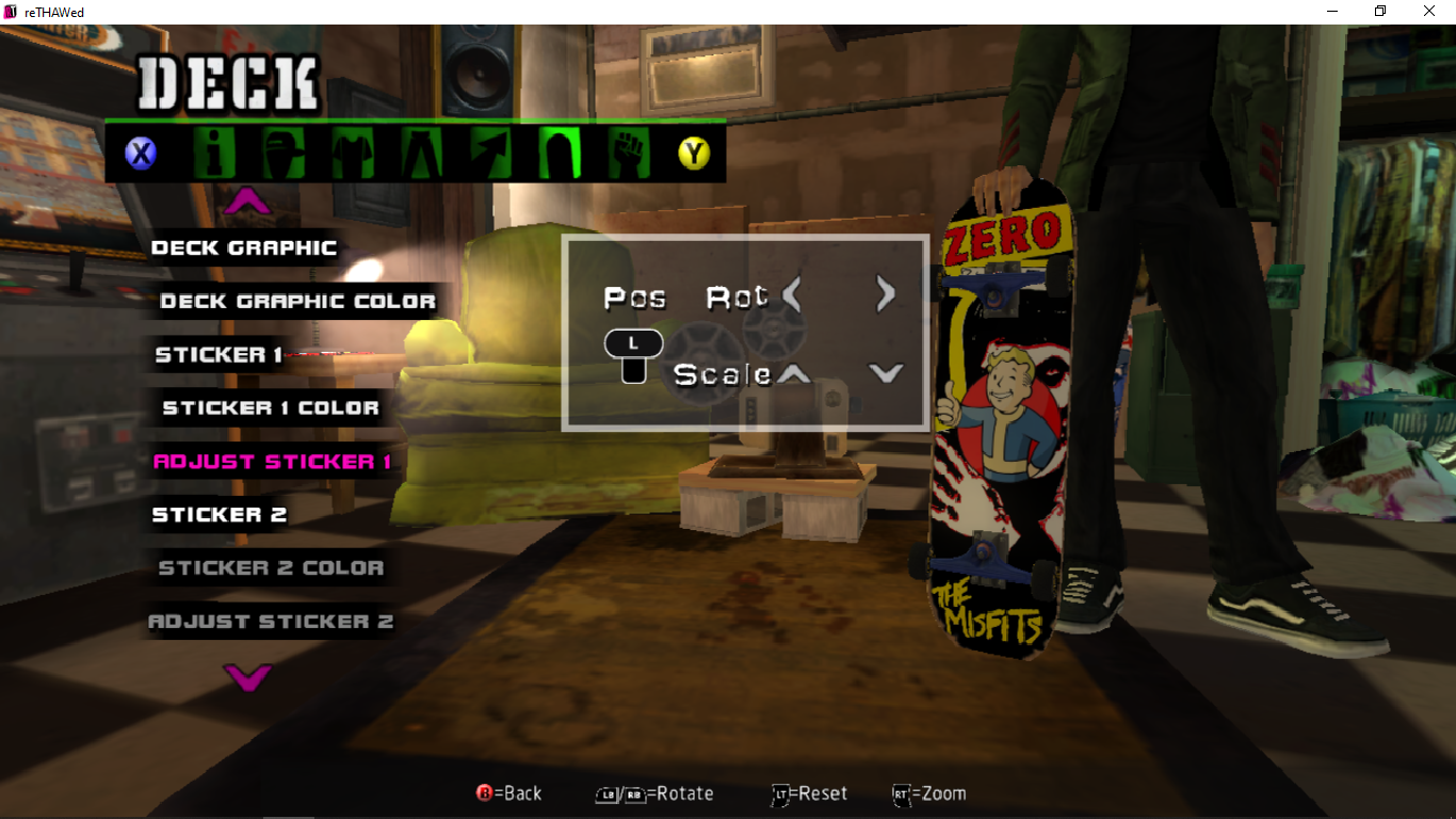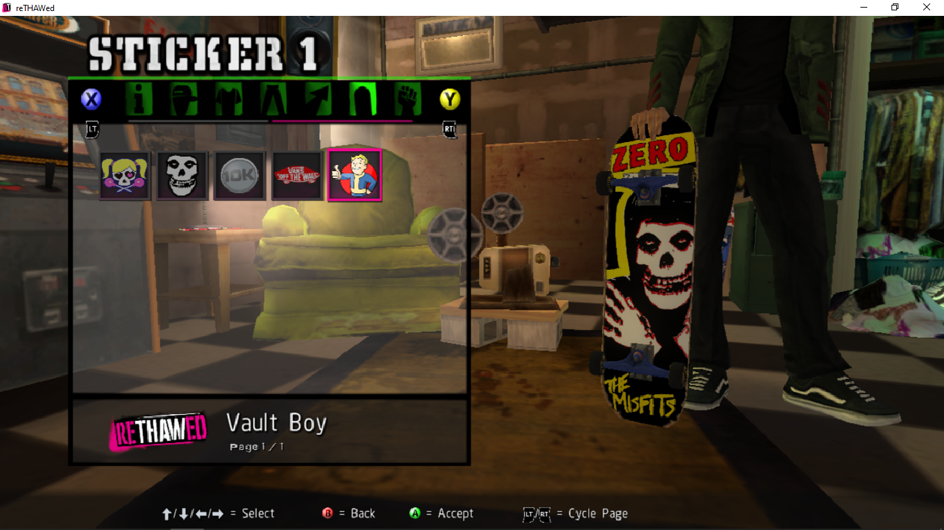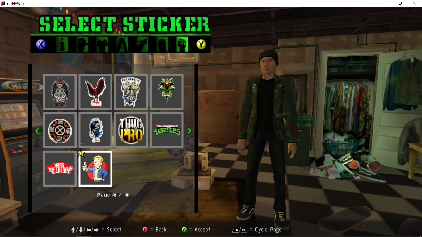 Installed stickers appear in the Sticker categories of the Create-a-Skater menu.