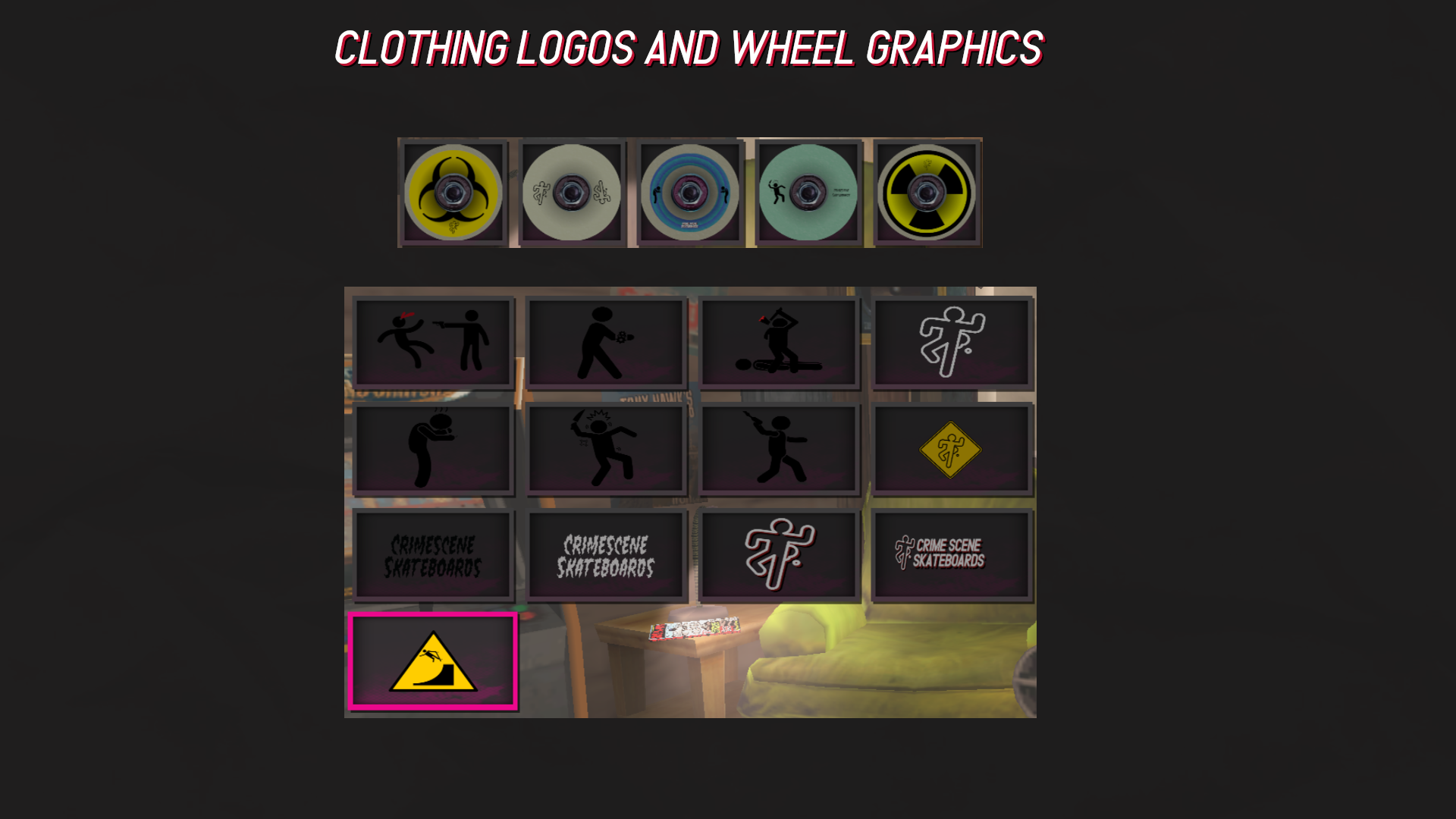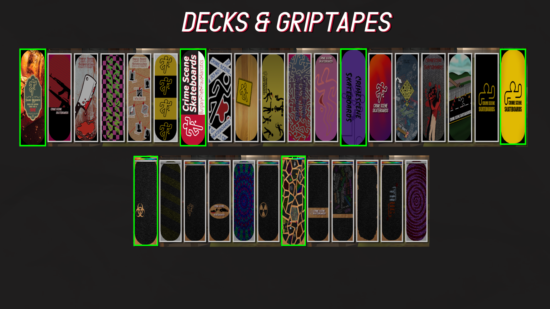 A pack containing decks, griptapes, logos, wheel graphics and stickers from my fictional skateboard brand "Crime Scene Skateboards".