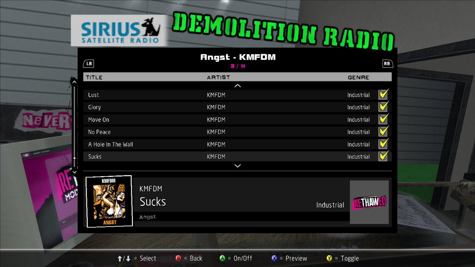 Installed soundtracks will appear in the Demolition Radio menu of the Music Options menu.