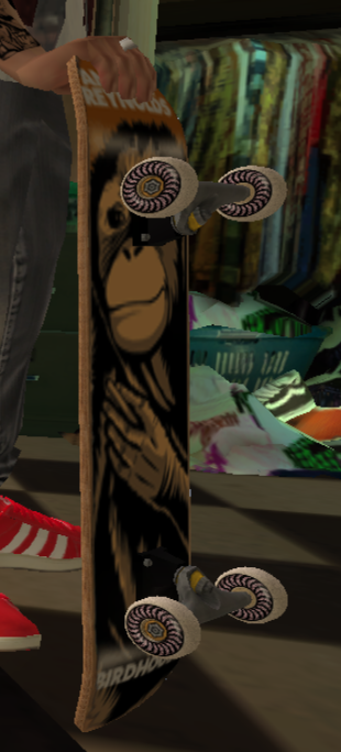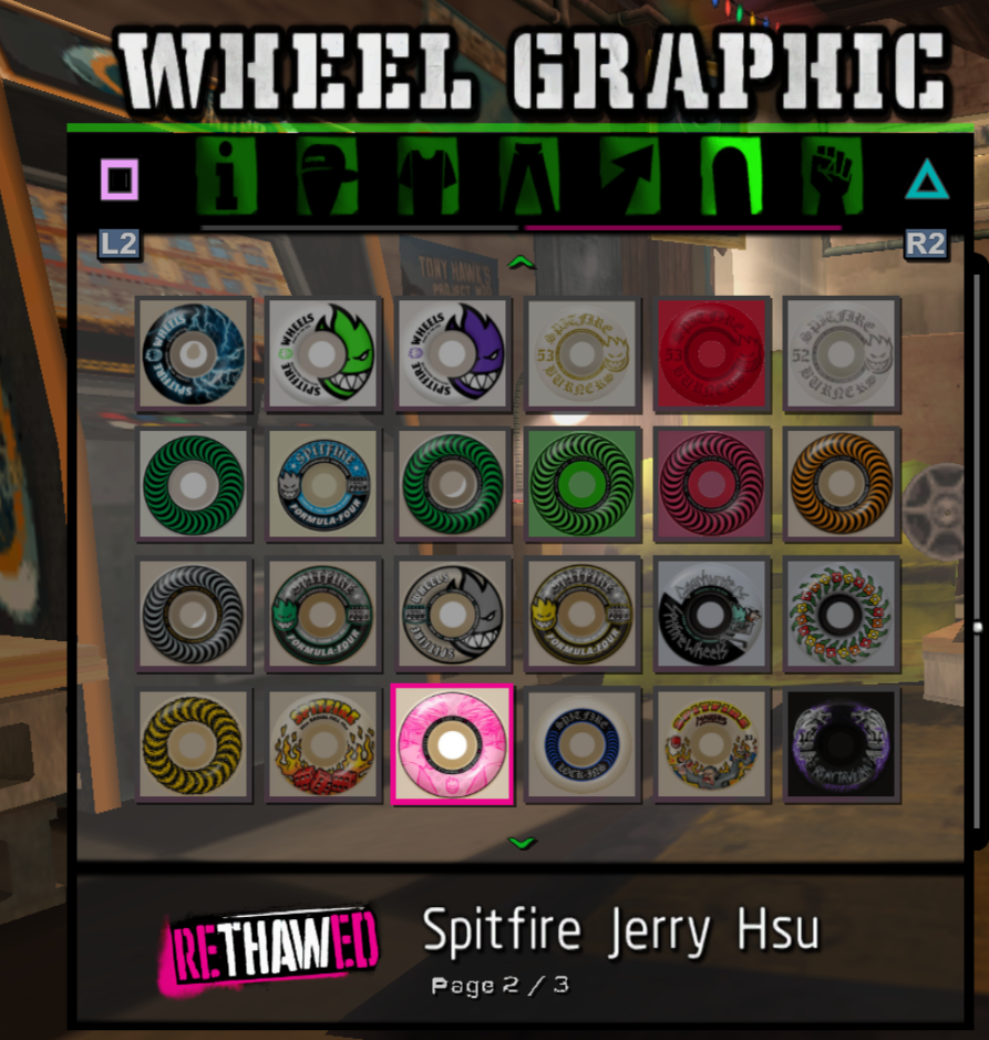 Installed graphics appear in the Wheel Graphic category of the Create-a-Skater menu when modifying wheels.