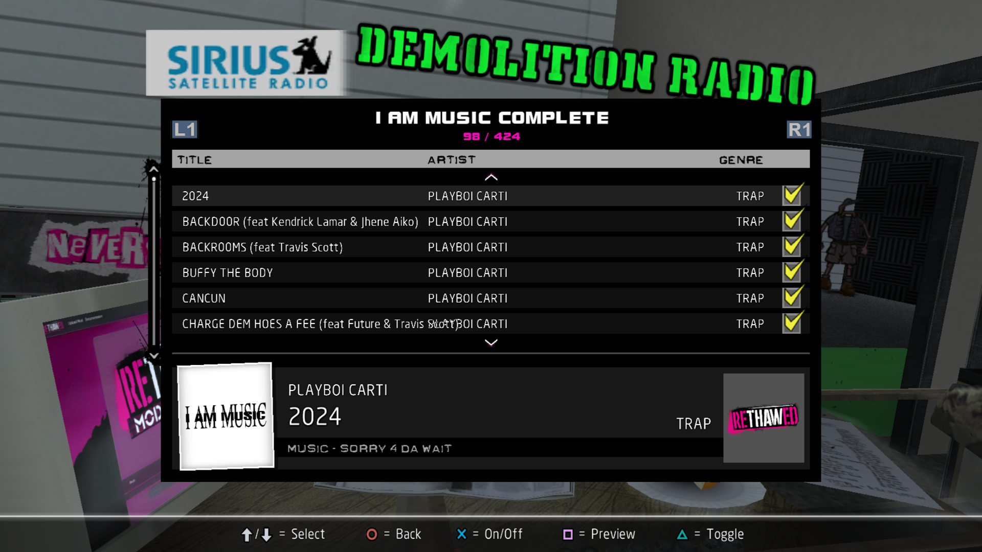 since all mods with Playboi Carti' MUSIC were incomplete, i decided to compile the WHOLE ALBUM, DELUXE AND SOME LEAKS into this mod (credit to thpsgoat users ixine for making the first MUSIC sountrack mod and stripa/lain for the idea)