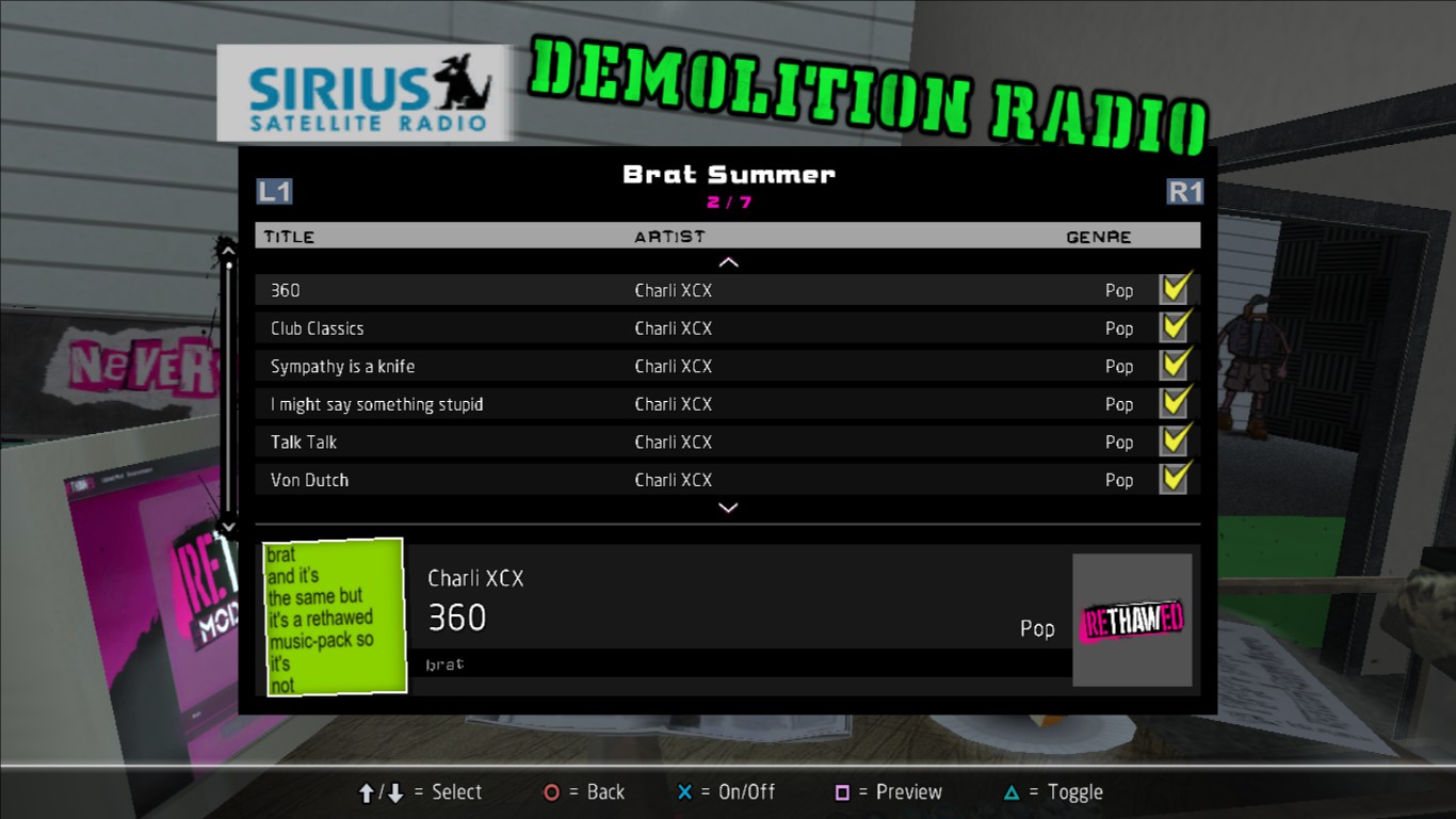 Installed soundtracks will appear in the Demolition Radio menu of the Music Options menu.