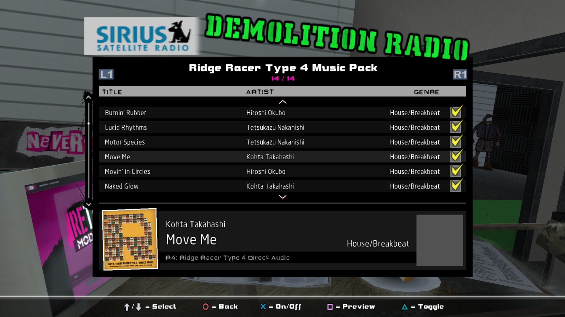 Installed soundtracks will appear in the Demolition Radio menu of the Music Options menu.