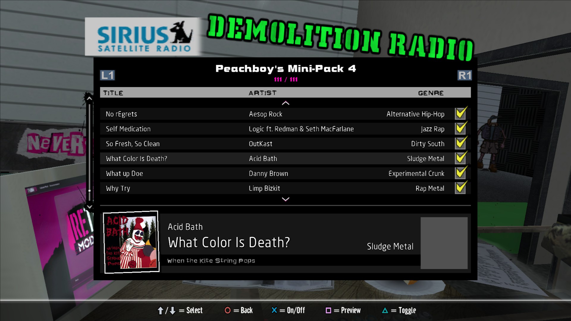 Installed soundtracks will appear in the Demolition Radio menu of the Music Options menu.