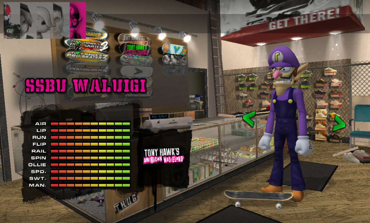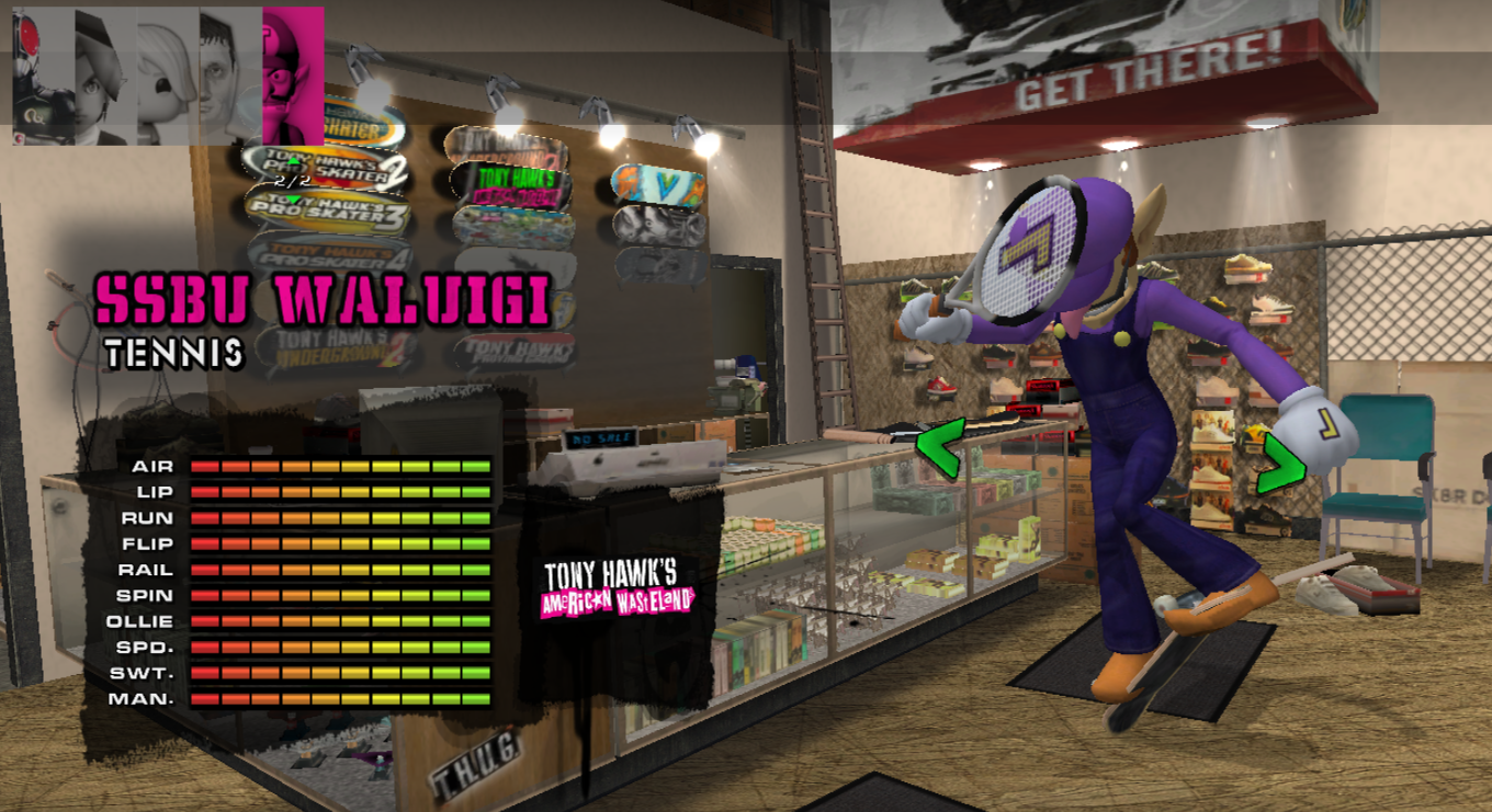 Waluigi as featured in Super Smash Brothers Ultimate, includes an alt skin with tennis racket