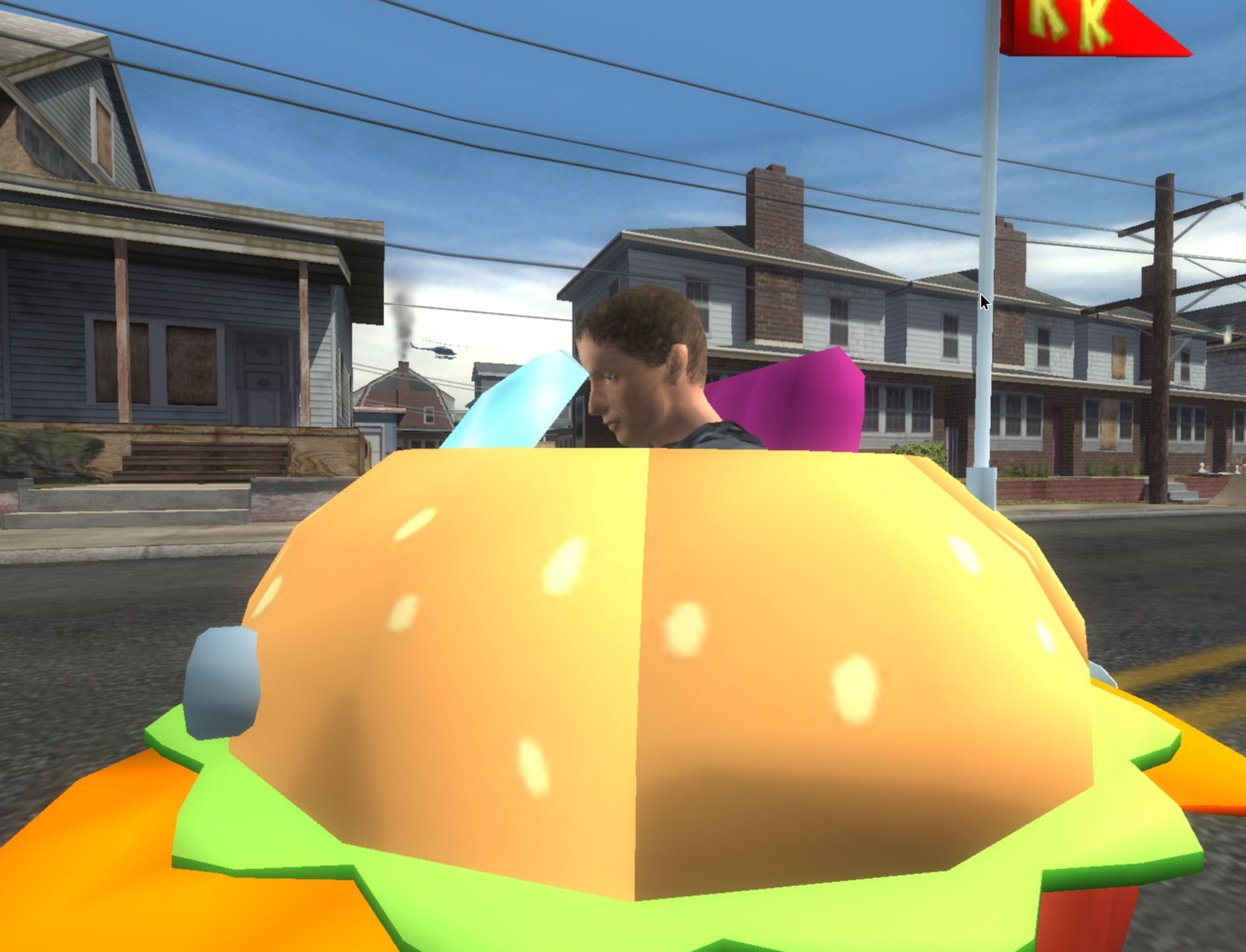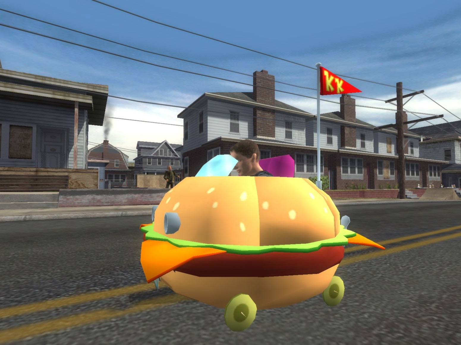 A mod that replaces the mini go-kart to the Patty Wagon from the Spongebob Squarepants Movie game, just press Select on your controller, go to Vehicles, and choose Minikart.
