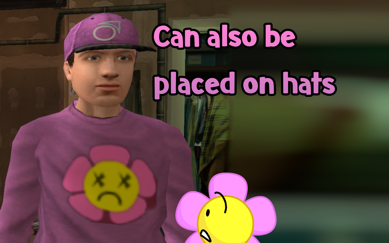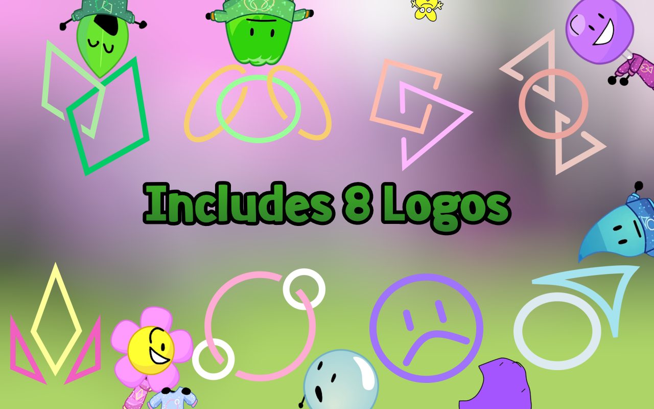 This mod includes 8 logos that were featured on the Glitter For Your Face Sweaters in BFB (Battle For Dream Island Season 4), including on that's on screen but no-one wore. These were all remade in Inkscape and have been stretch corrected (ex: Bubble's a very wide character and the decal on her sweater stretched when she wore it, but I changed it back to proper circles.) You can place these on any accessory that accepts stuff from the UserMods/Logos folder, mainly Shirts and Hats.