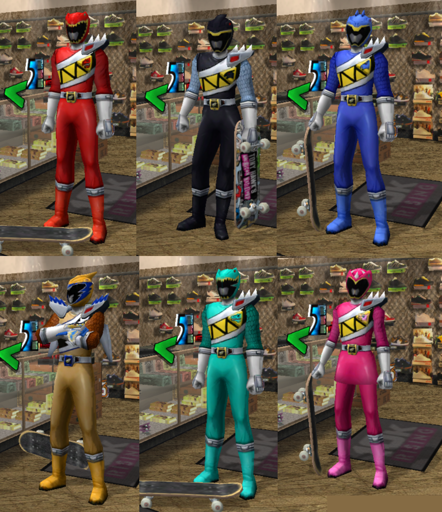 Features the red, black, blue, green, pink, and gold rangers from the japanese toku series "Zyuden Sentai Kyoryuger", also known as Power Rangers Dino Charge. Uses the Power Rangers naming for ease. Sourced from the 3DS game of the aforementioned Kyoryuger.