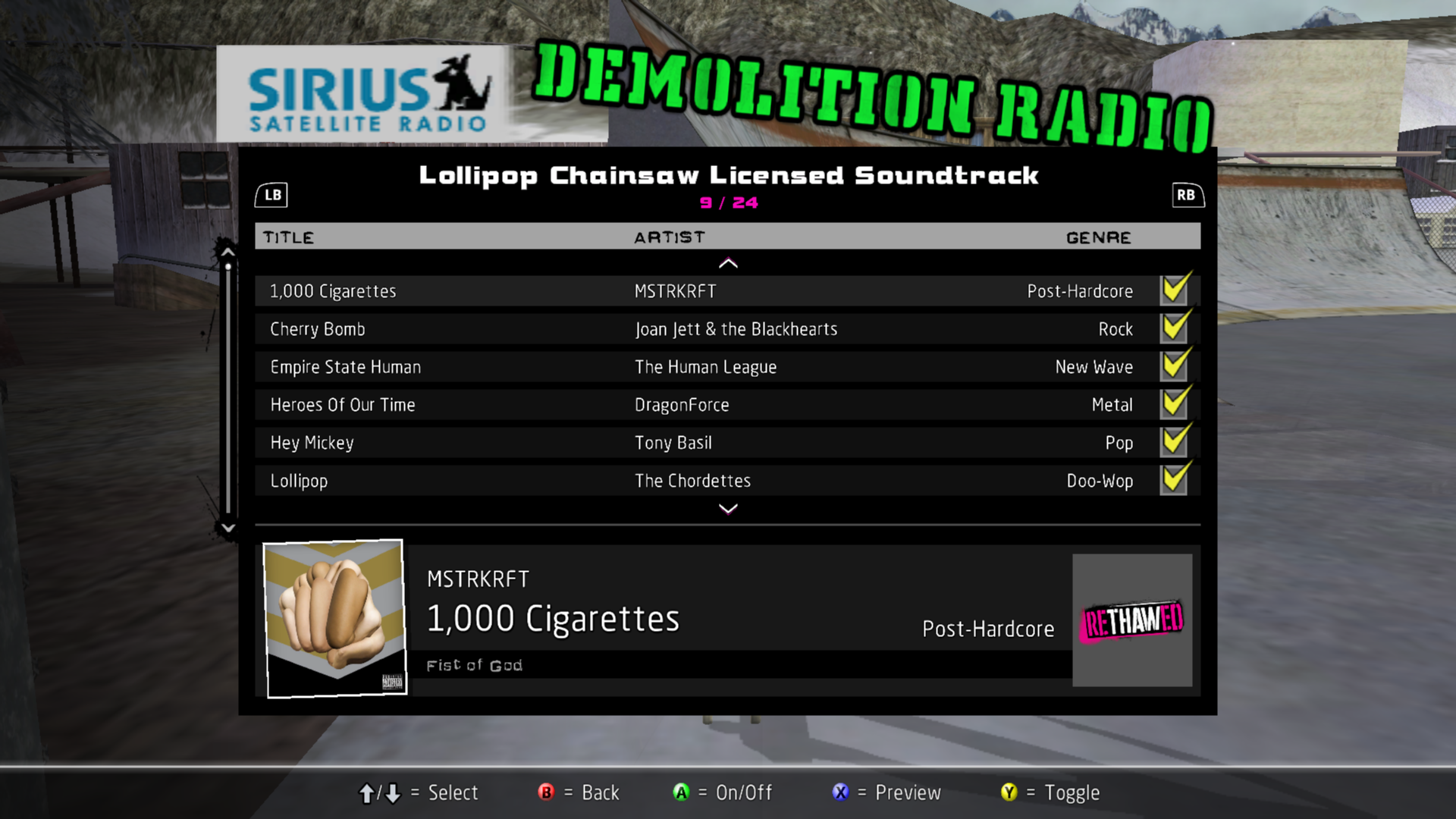 Installed soundtracks will appear in the Demolition Radio menu of the Music Options menu.