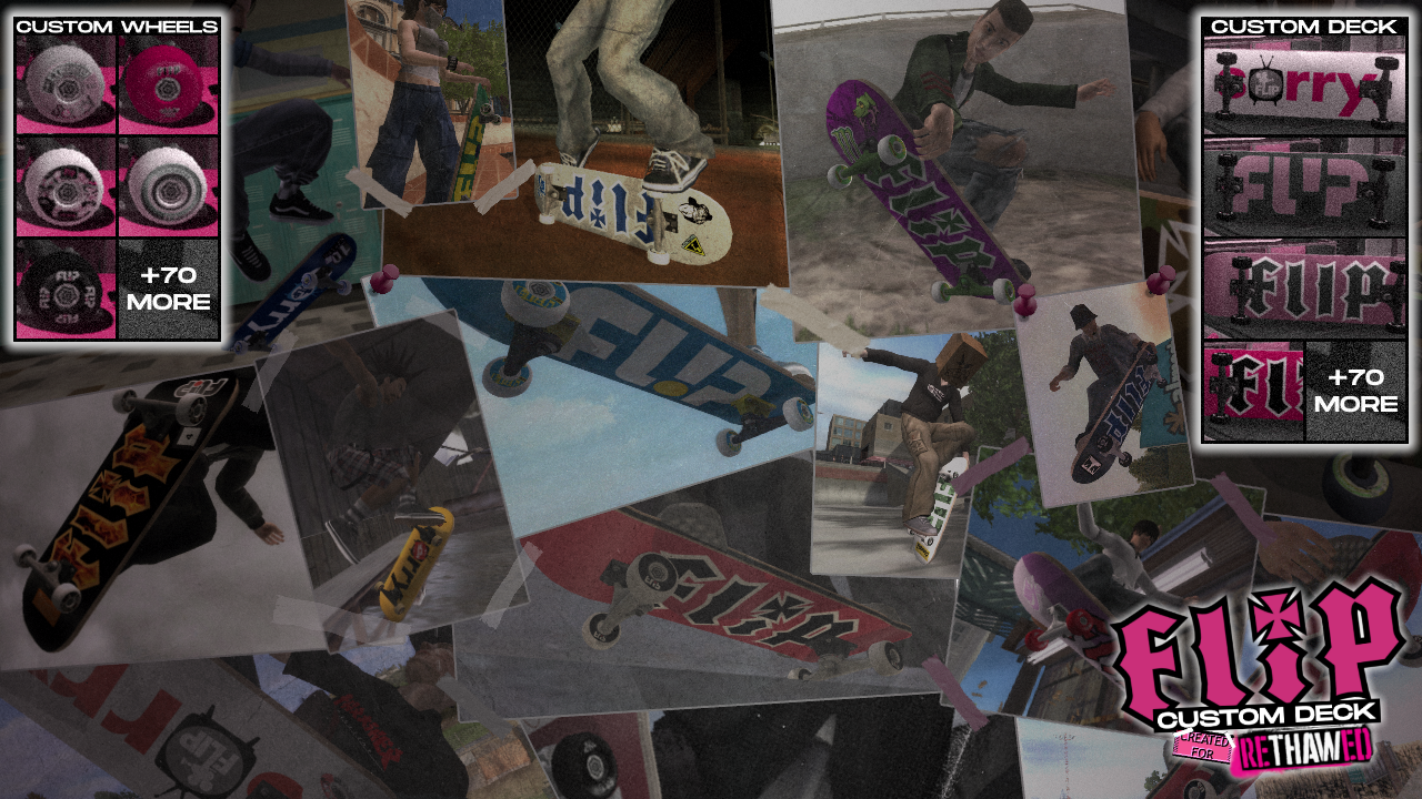 I was waiting for someone to add maybe some deck pack that include something from FLIP, but I waited long enough to say to myself: Fine, I'll do it myself. I know the reTHAWed includes an HKD model, but I didn't like the quality. I decided not to look for a suitable photo of this classic board, instead I recreated this model to fit the game. This allowed me to create decks that were inspired by existing boards, but I didn't stop myself from experimenting with new colors. This pack contains 96 decks and 87 wheels. You can use only favorite one or you can use all of them! I just hope you will like it.