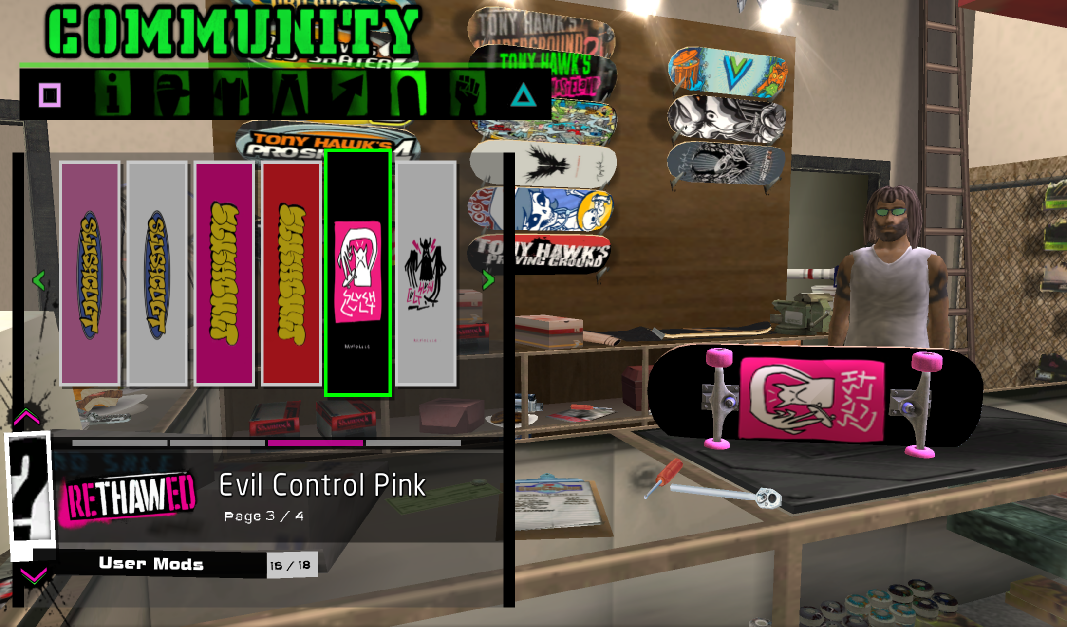 Installed items will show in the Deck Graphic category of the Create-a-Skater menu.