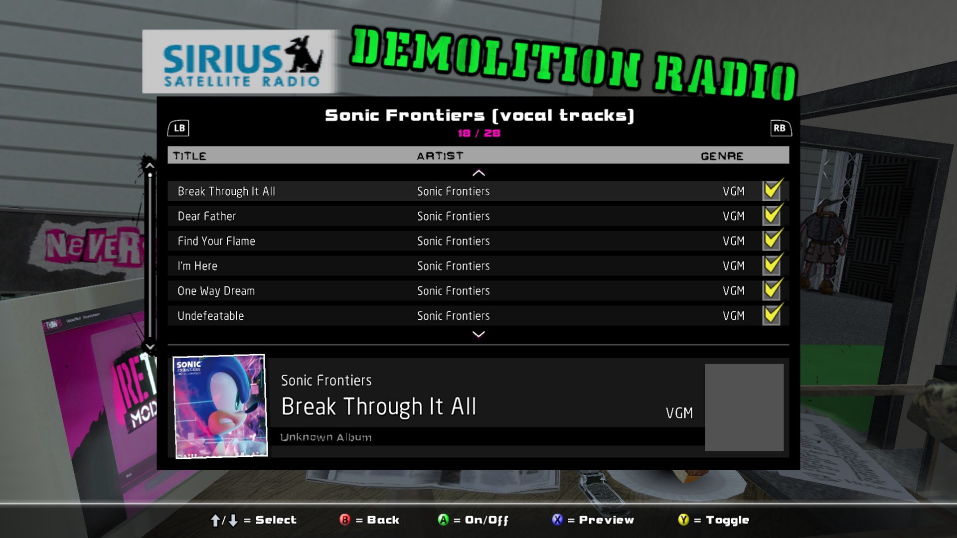 Installed soundtracks will appear in the Demolition Radio menu of the Music Options menu.