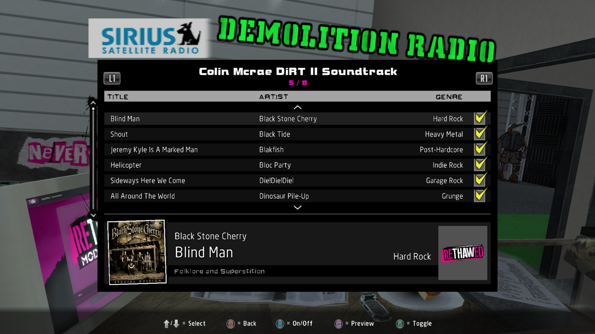 Installed soundtracks will appear in the Demolition Radio menu of the Music Options menu.