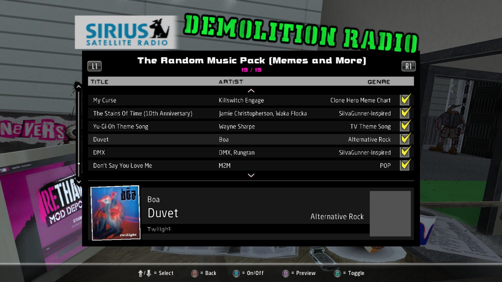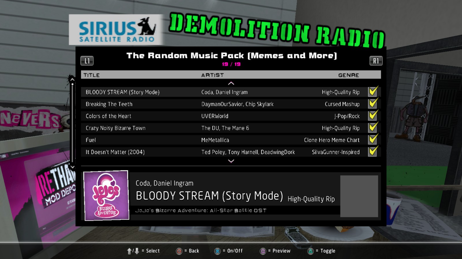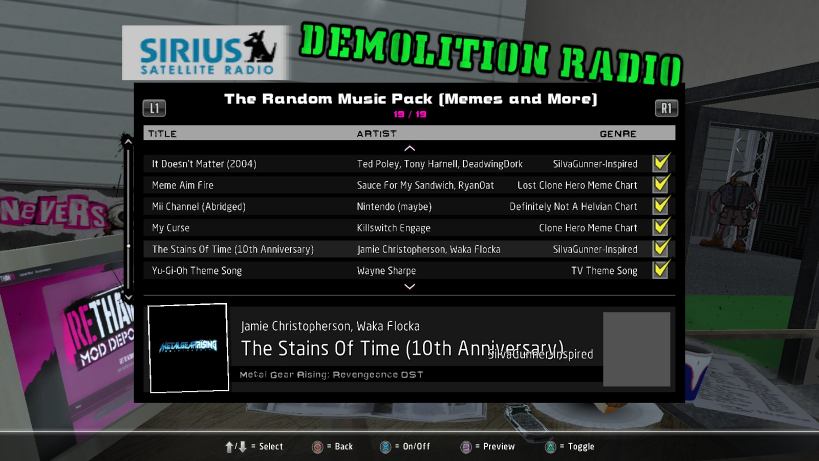 Installed soundtracks will appear in the Demolition Radio menu of the Music Options menu.