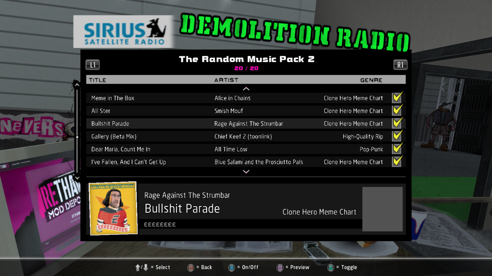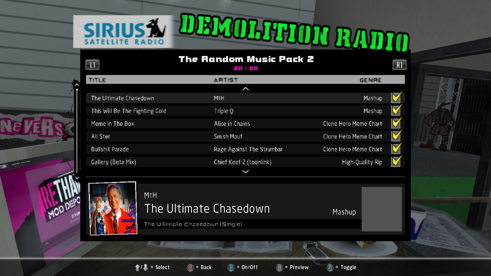 Installed soundtracks will appear in the Demolition Radio menu of the Music Options menu.