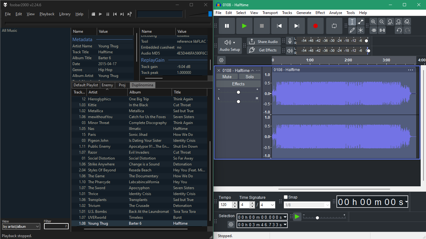 Again, I mostly fetched the audio files in 16-bit/44.1 kHz FLAC quality from SoulSeek. I wasn't able to find Pigeon John's "Identity Crisis," so I resorted to web-based YT converters, oof. Regardless, I then imported them into Audacity and Foobar2000 for audio leveling and binked the exported WAVs with RAD Video Tools v0.8i. Once again as well, I converted my album covers to .img.wpc. I'm becoming much more used to this new modus operandi than I was when making Enemy. By the way, go have a look at that as well!