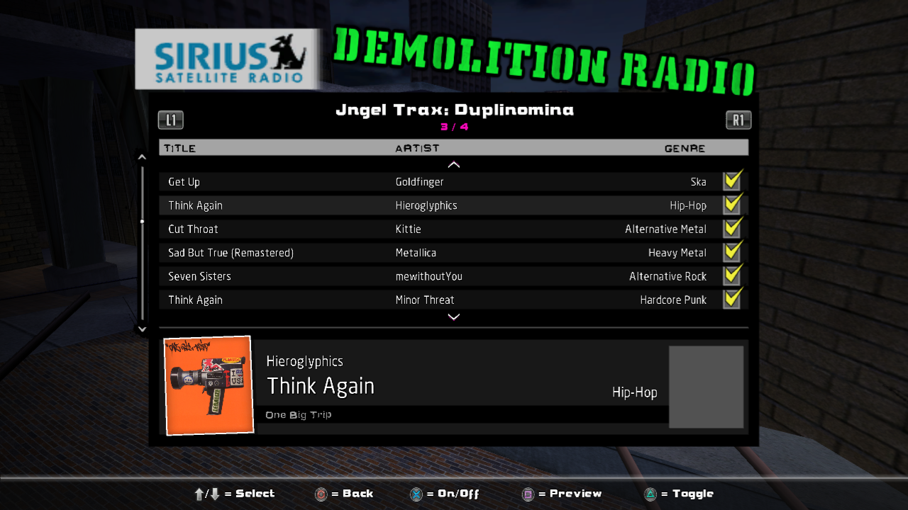 The idea for this soundtrack's theme came to my mind while I was searching through Thrice's discography. I stumbled upon "Identity Crisis," and that immediately reminded me of the similarly named song from Pigeon John. I figured there may be more pairs of similarly named songs that I could put together in a skater-friendly playlist, and so I started another arduous scavenger hunt throughout Spotify. Ultimately, this soundtrack not only reintroduces artists previously featured in Enemy, but also features much more artists that made their cut in a TH game. This time, I fished for song suggestions after I chose my 32 and ended up with 5 additional songs.
