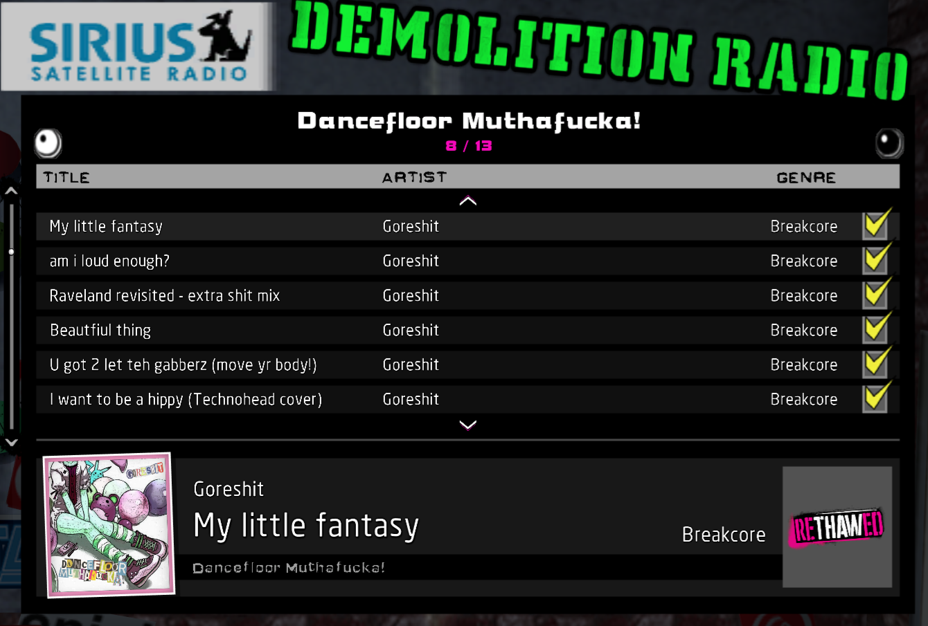 Goreshit's delightful album "Dancefloor Muthafucka!" ported to reTHAWed! contains the album as a soundtrack, 4 logos, and 2 deck stickerzz!!