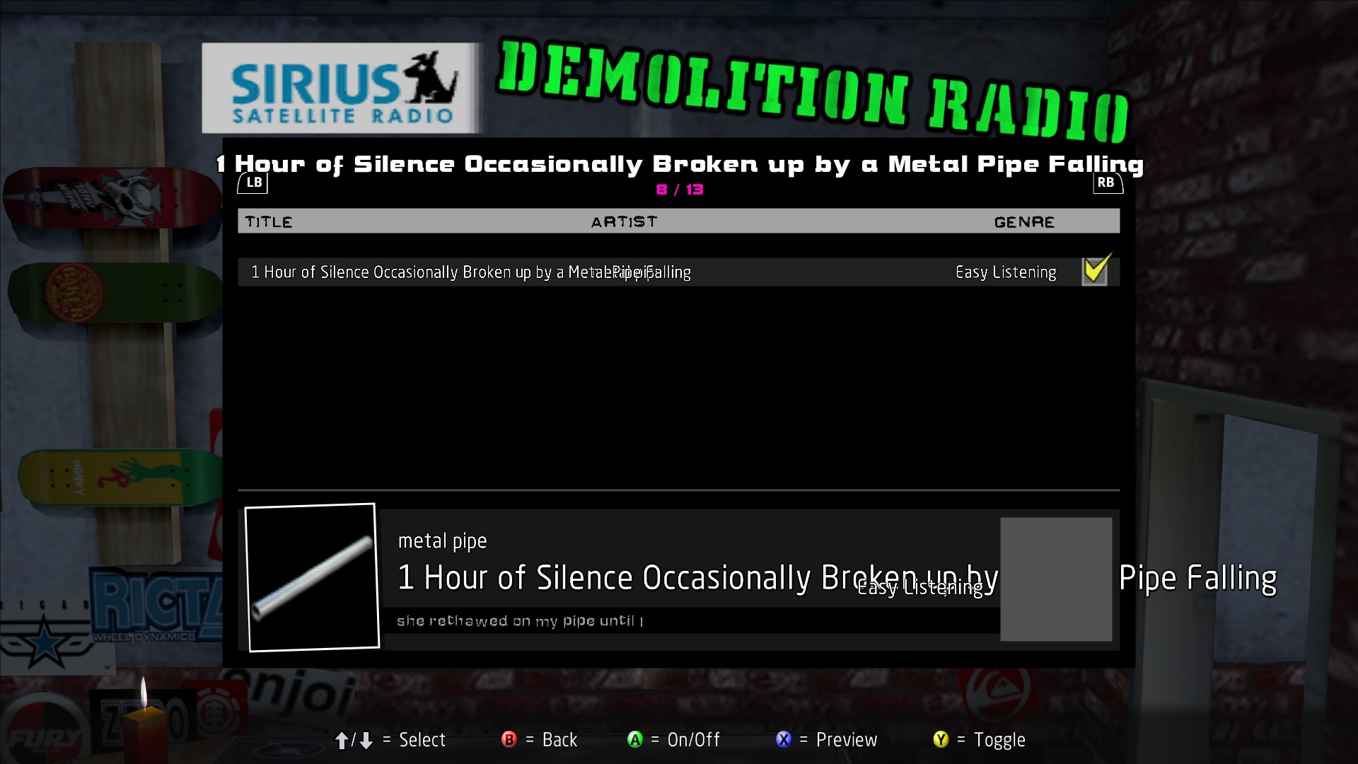 Installed soundtracks will appear in the Demolition Radio menu of the Music Options menu.