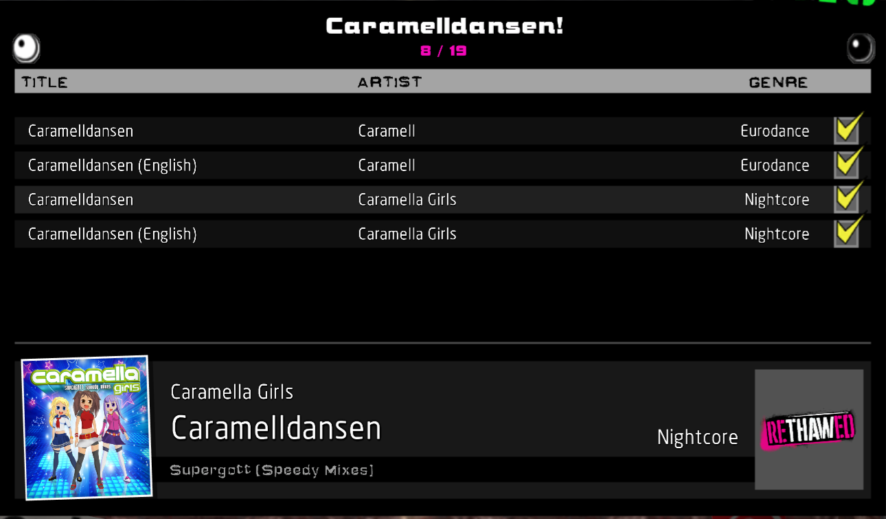 contains 4 versions of Caramelldansen! the original by Caramell, the english version by Caramell, and both of the iconic "speedy" versions by The Caramella Girls!!