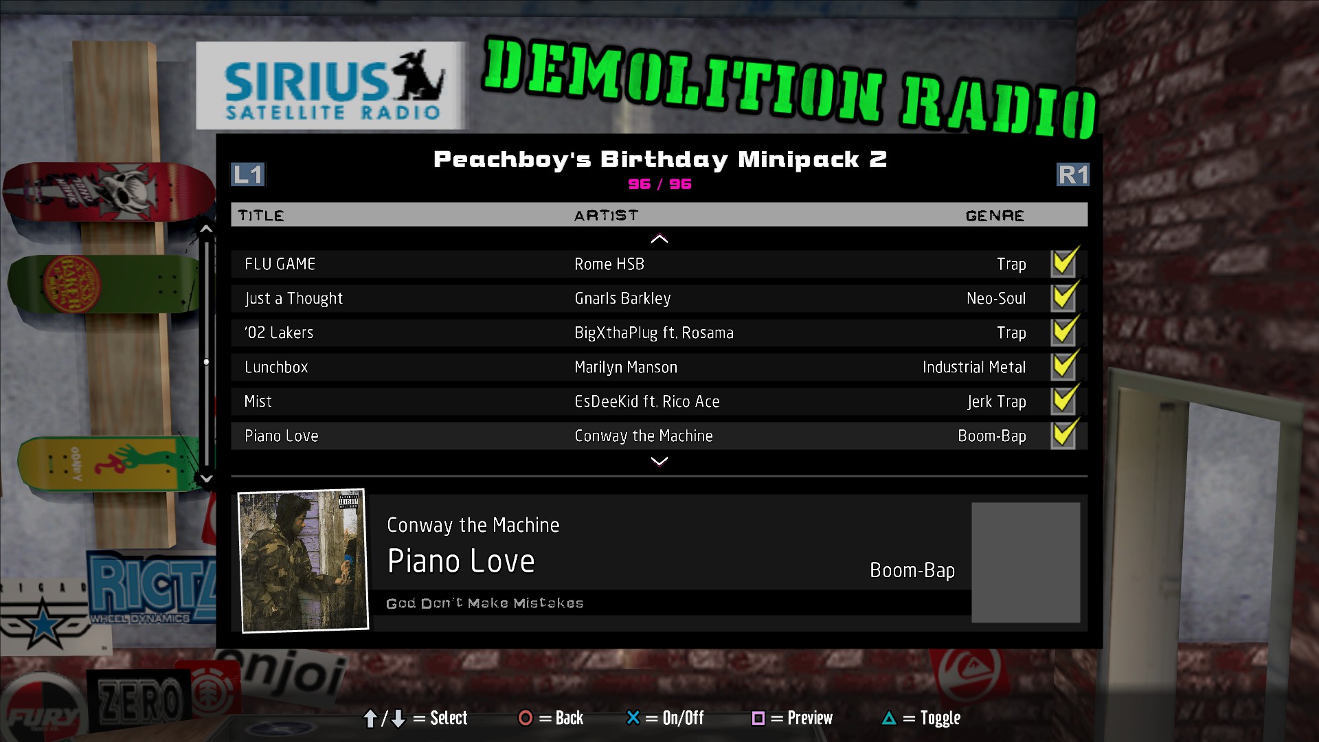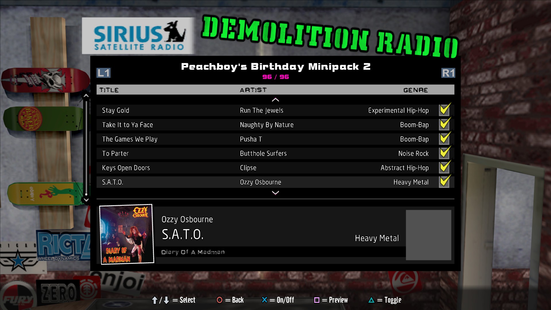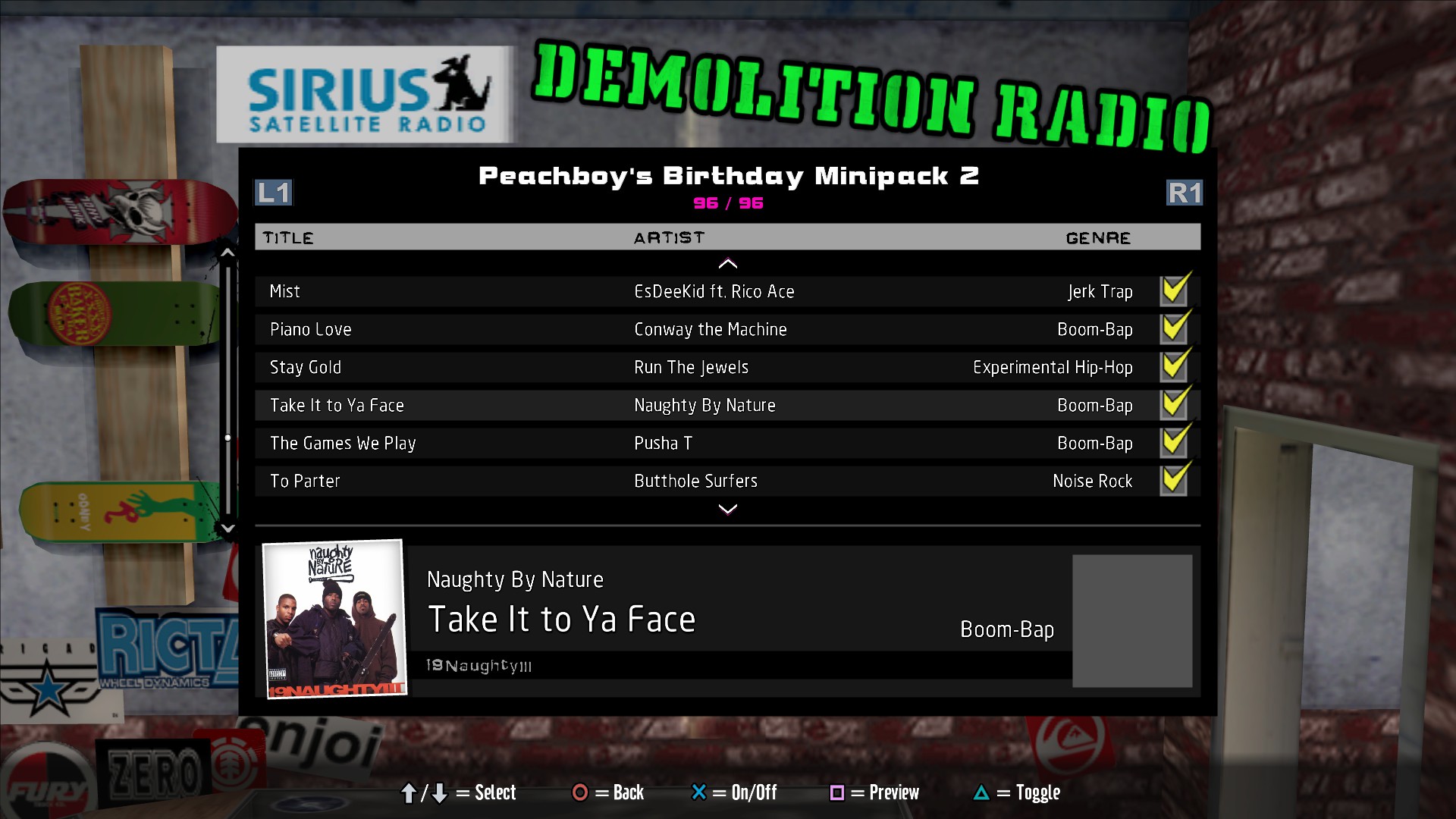 Installed soundtracks will appear in the Demolition Radio menu of the Music Options menu.