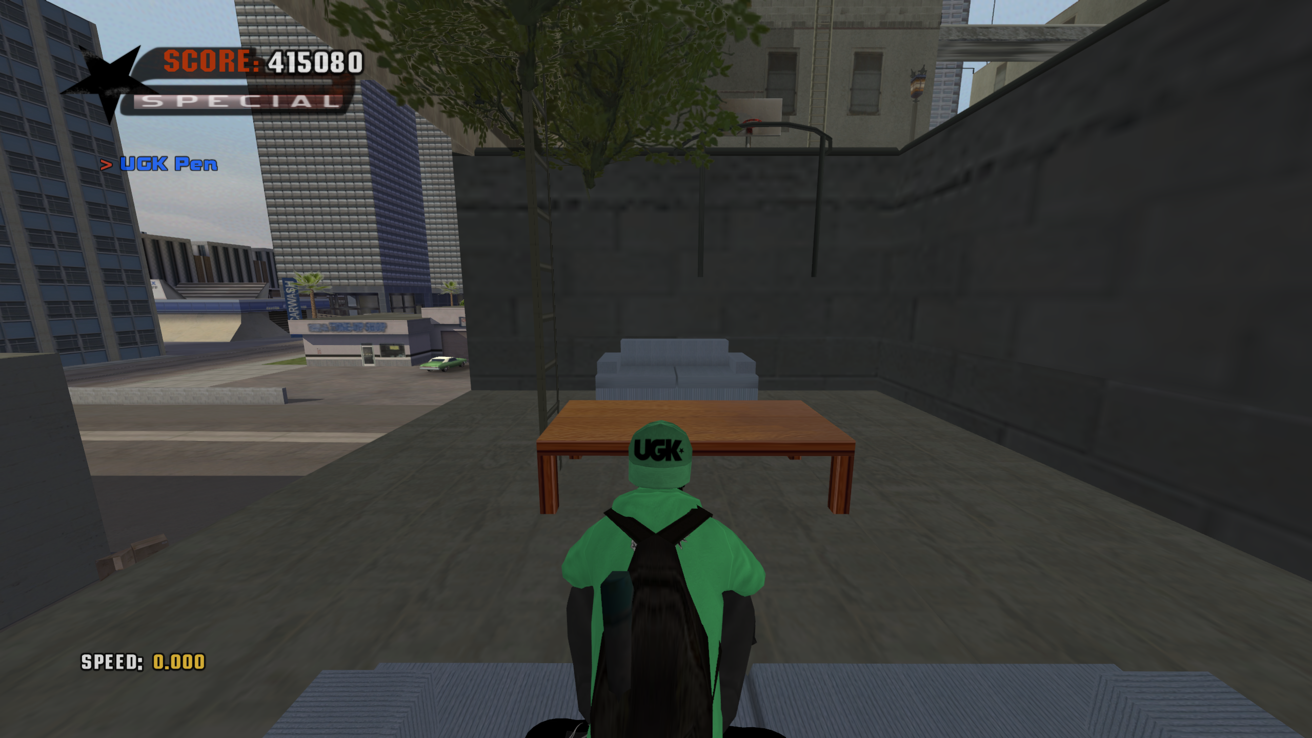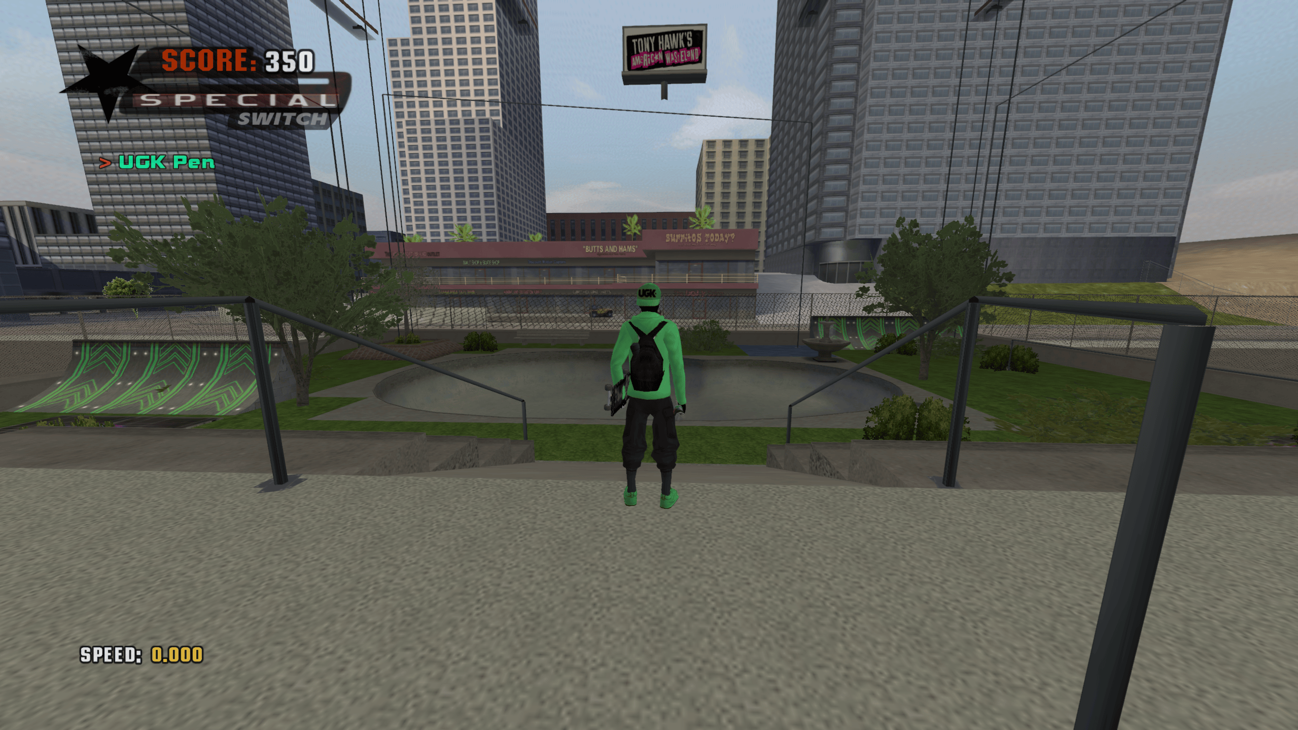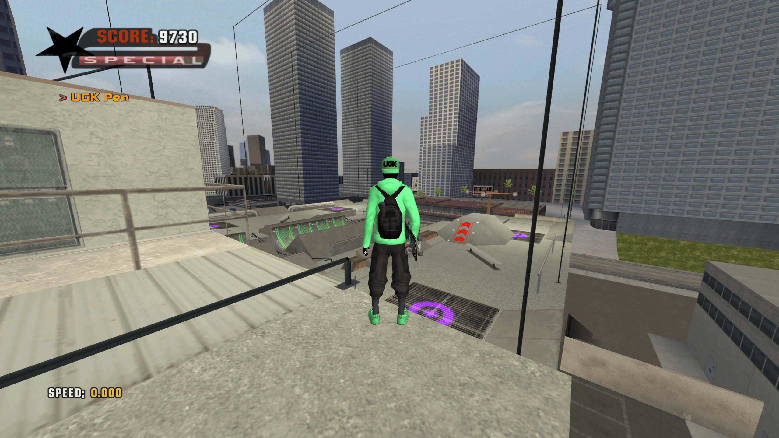 Downhill map featuring rooftops and a pool at the bottom