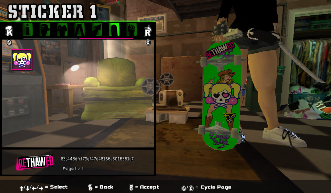 Installed stickers appear in the Sticker categories of the Create-a-Skater menu.