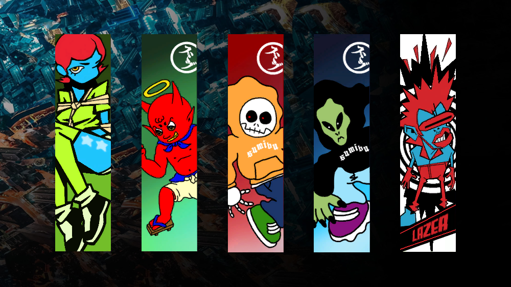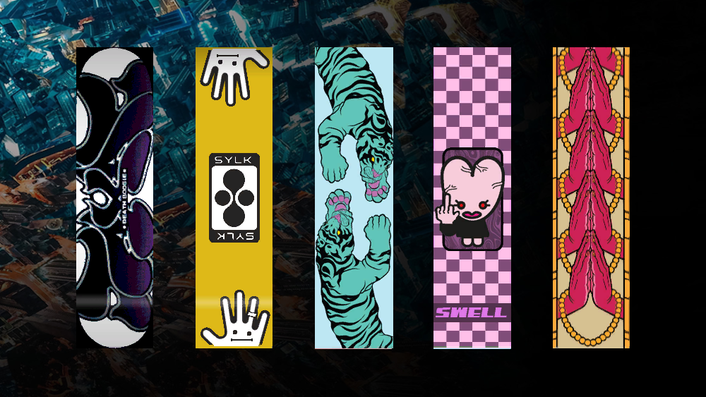 Skate decks from the 2023 Jet Set Radio-inspired video game Bomb Rush Cyberfunk. Includes all 10 decks and the 4 props NPC decks.