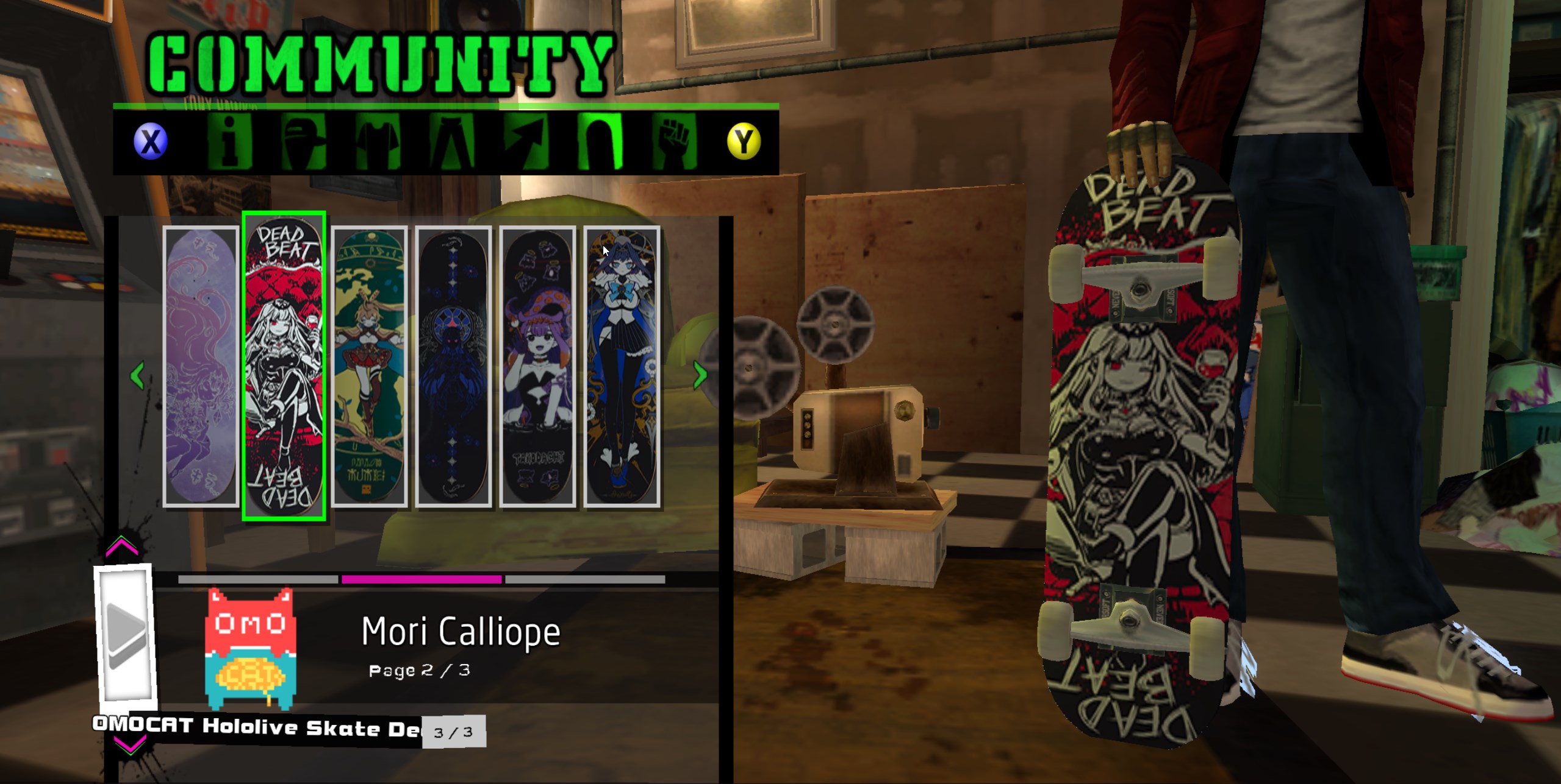 Hololive EN themed skate deck graphics from the July 4th OMOCAT skateboard merch line.