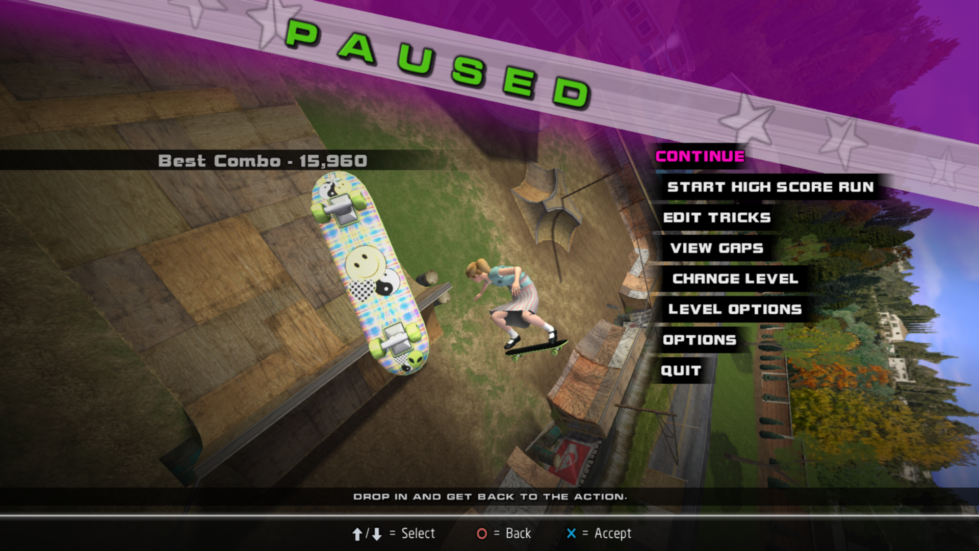 Nicki Hoffman loves skateboarding, and legend has it that she played the original PS1 release of THPS as her favourite ripper Elissa Steamer. I guess this is a full circle moment then now that I put her board in the game.