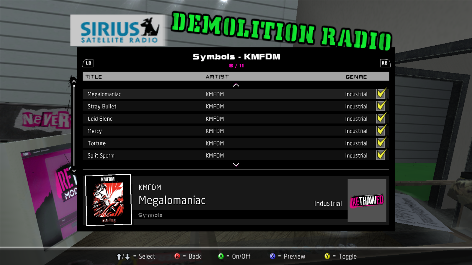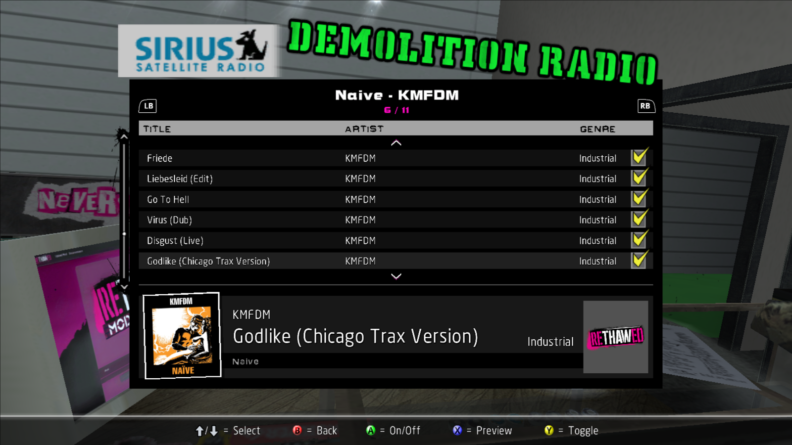 Installed soundtracks will appear in the Demolition Radio menu of the Music Options menu.