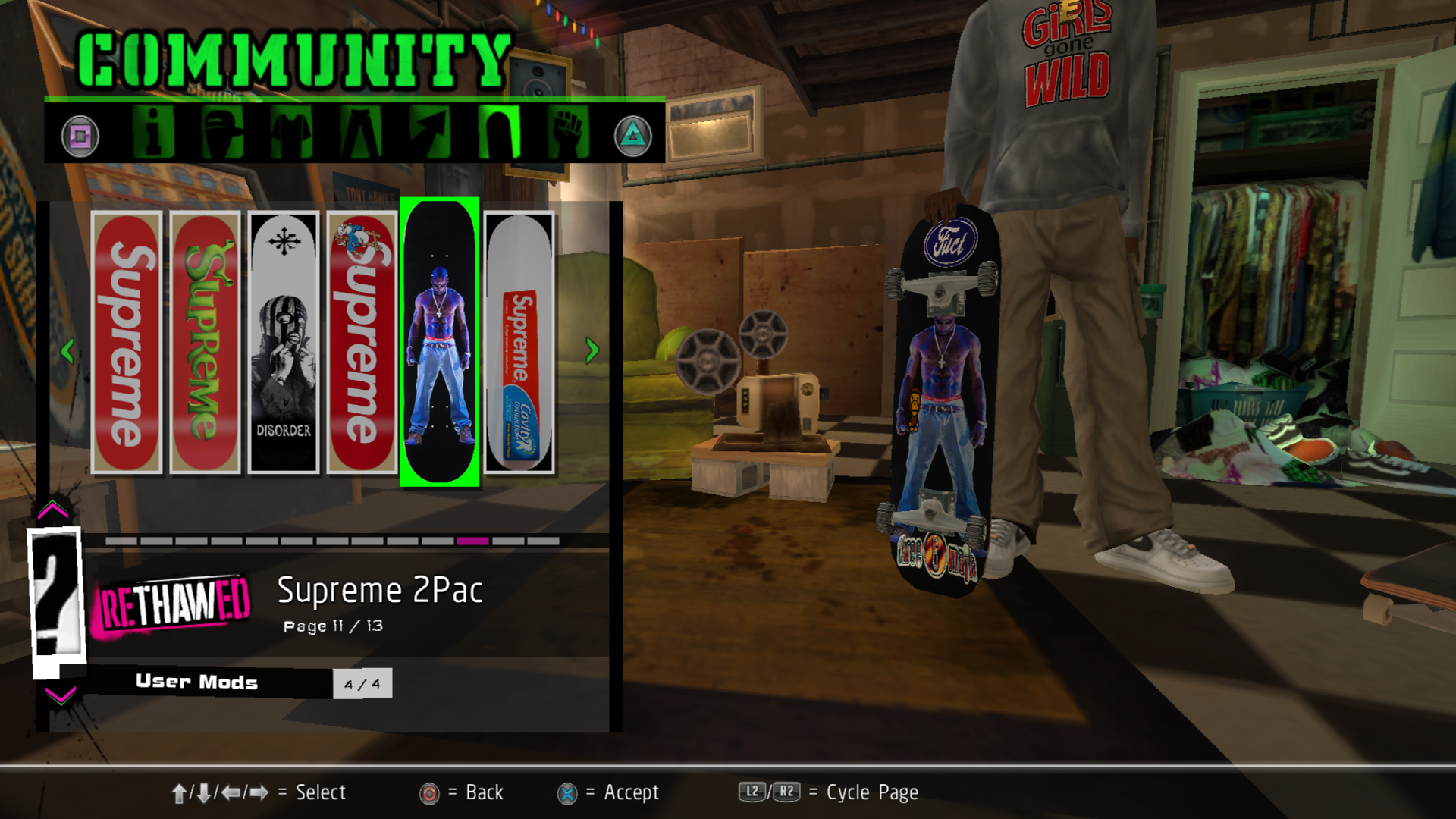 Installed items will show in the Deck Graphic category of the Create-a-Skater menu.