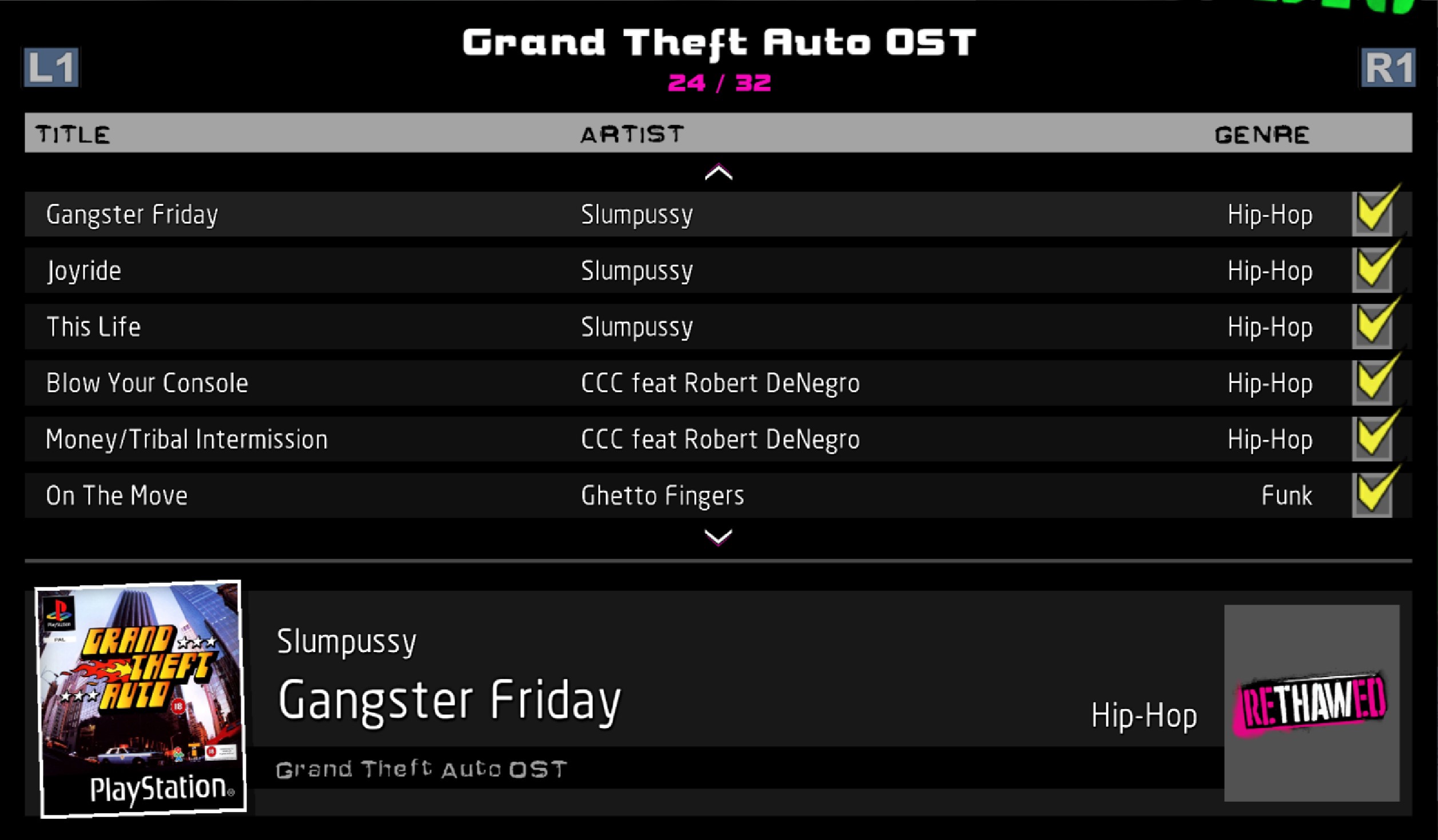 Included is the cover to GTA for the Playstation, genres (in the hopes that 10K add the ability to only play certain genres PLEAASE!!!! ;P), and the RETHAWED logo.