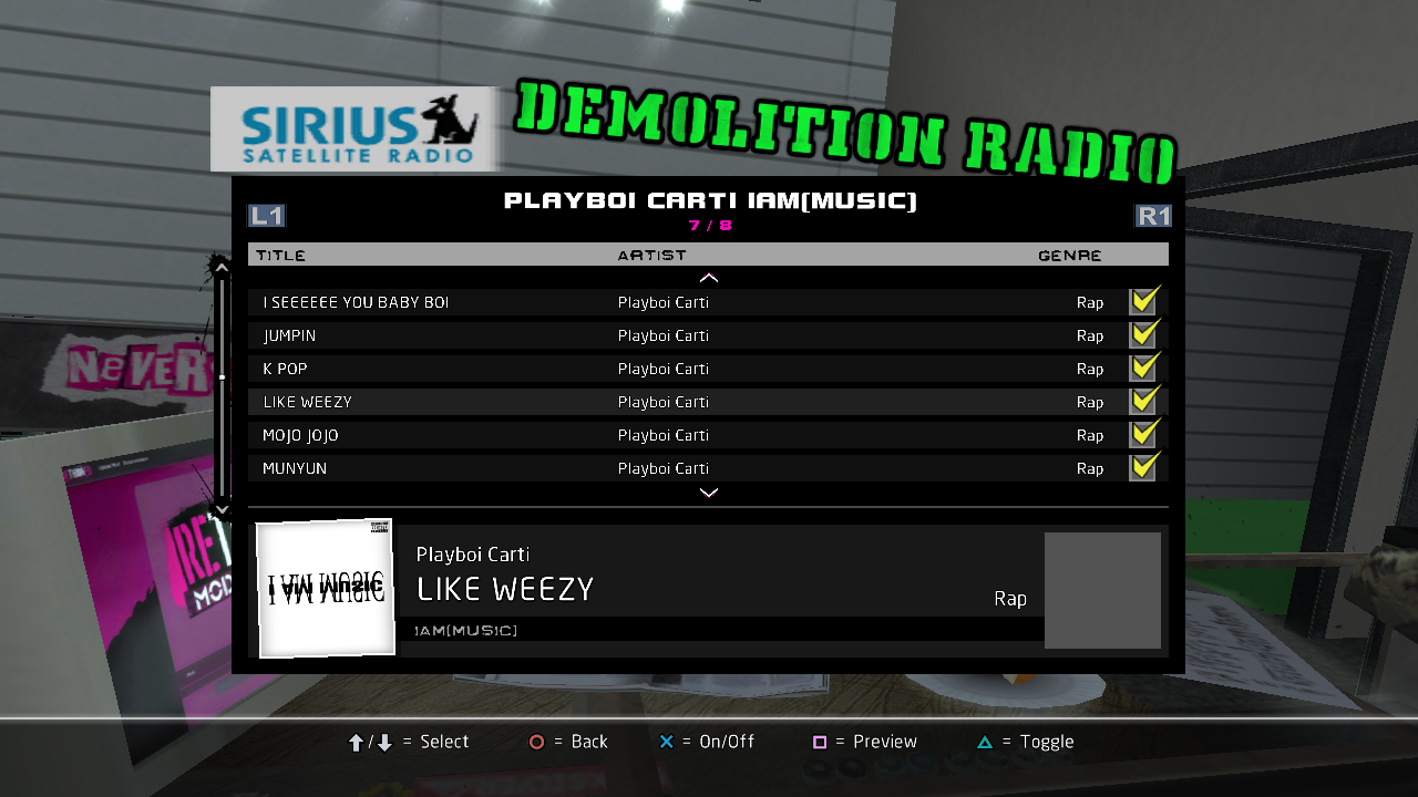 Installed soundtracks will appear in the Demolition Radio menu of the Music Options menu.