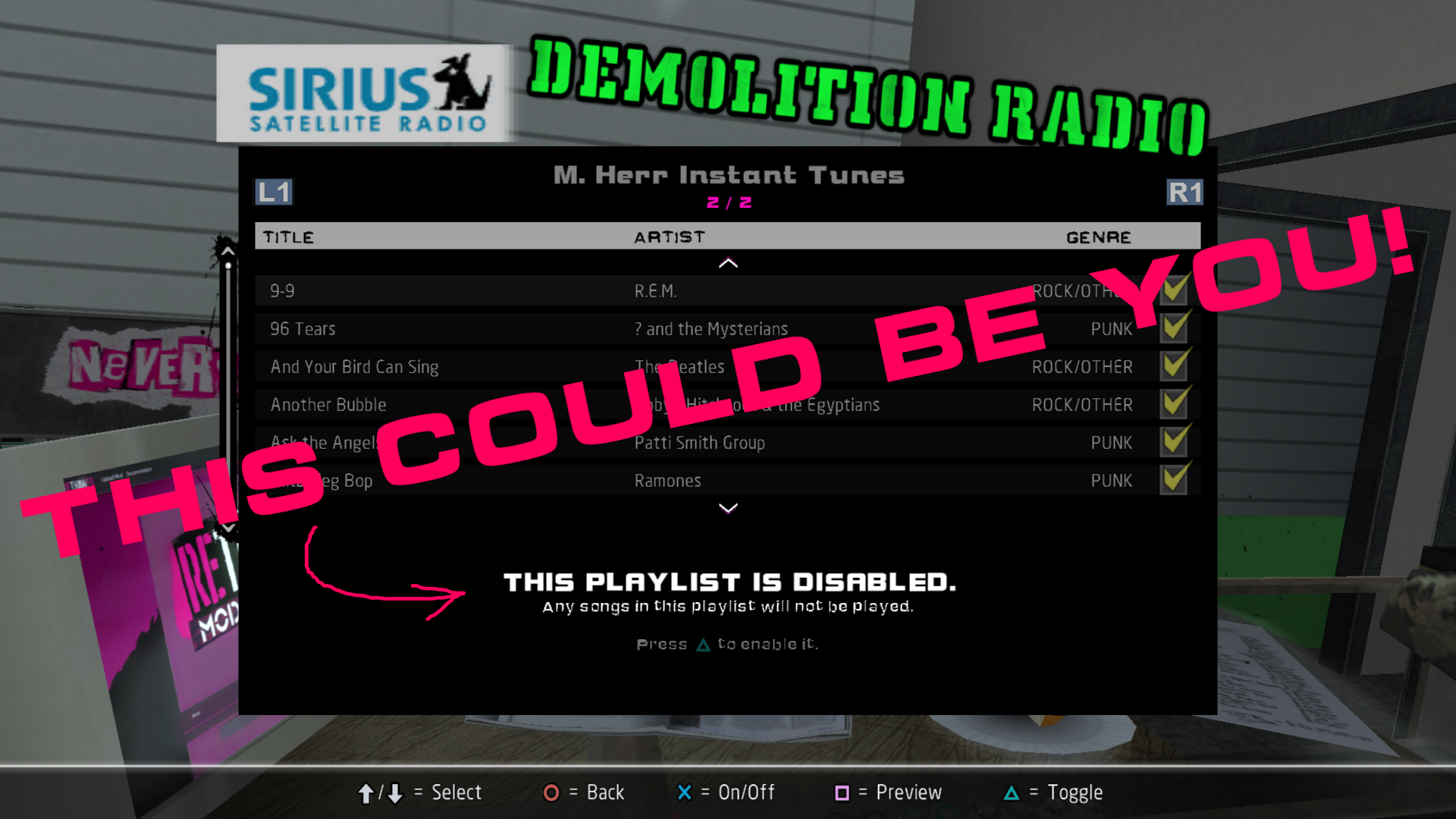 Installed soundtracks will appear in the Demolition Radio menu of the Music Options menu.