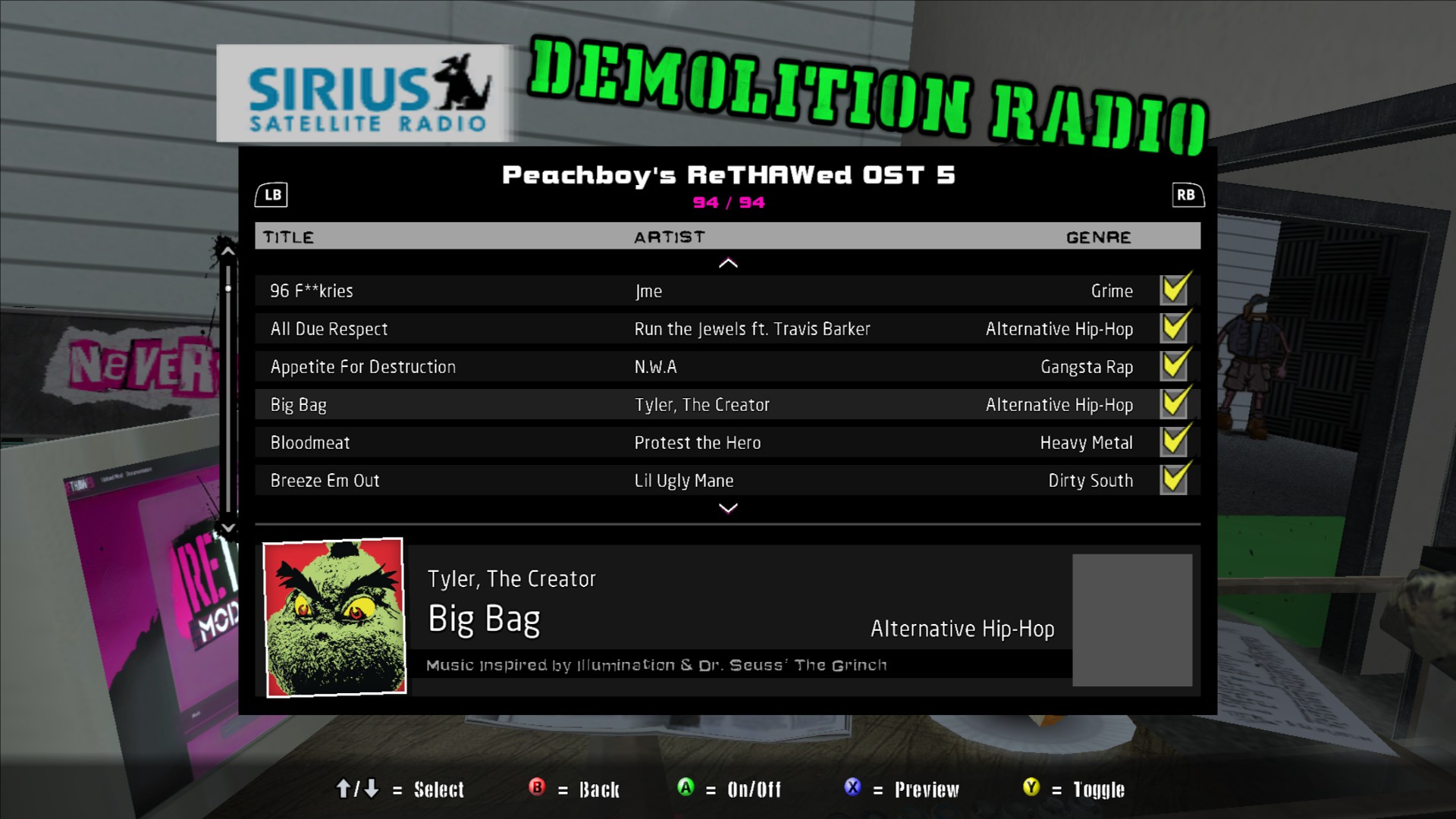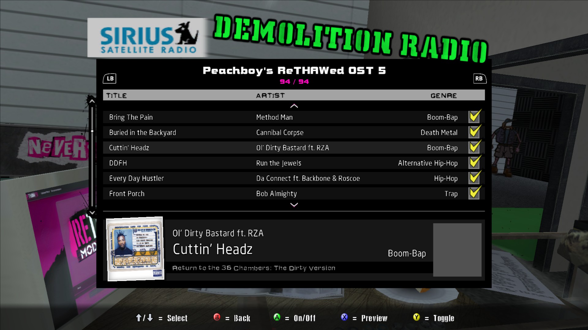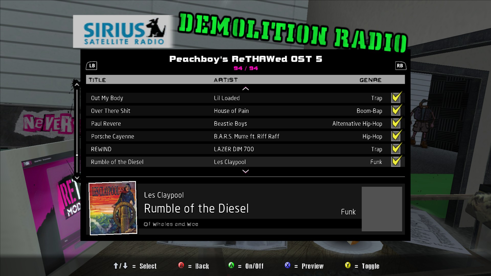 Installed soundtracks will appear in the Demolition Radio menu of the Music Options menu.