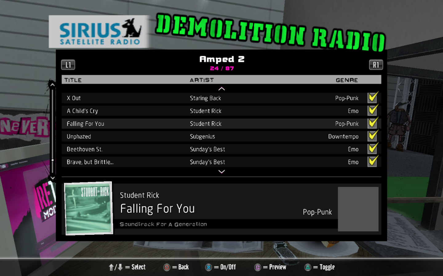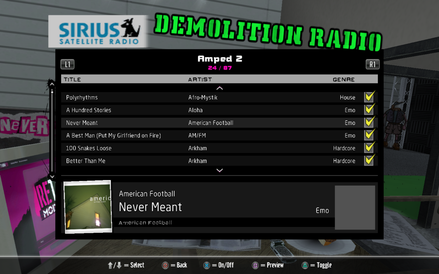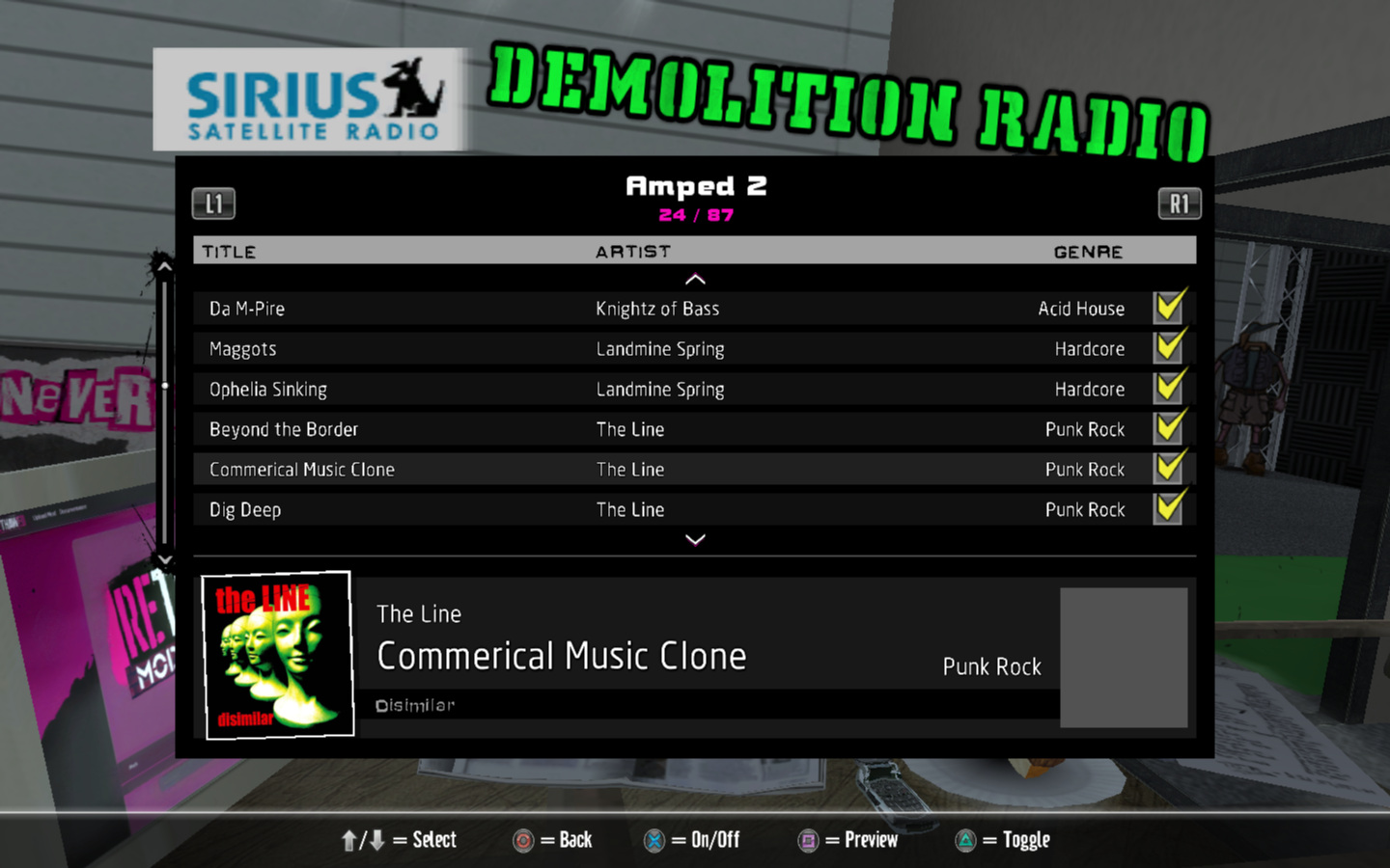 WARNING: Scrolling to this playlist in the Demolition Radio menu may cause the game to crash. This isn't consistent, however. It may not crash at all, or it may crash the first time you go to it. Use this soundtrack with caution.