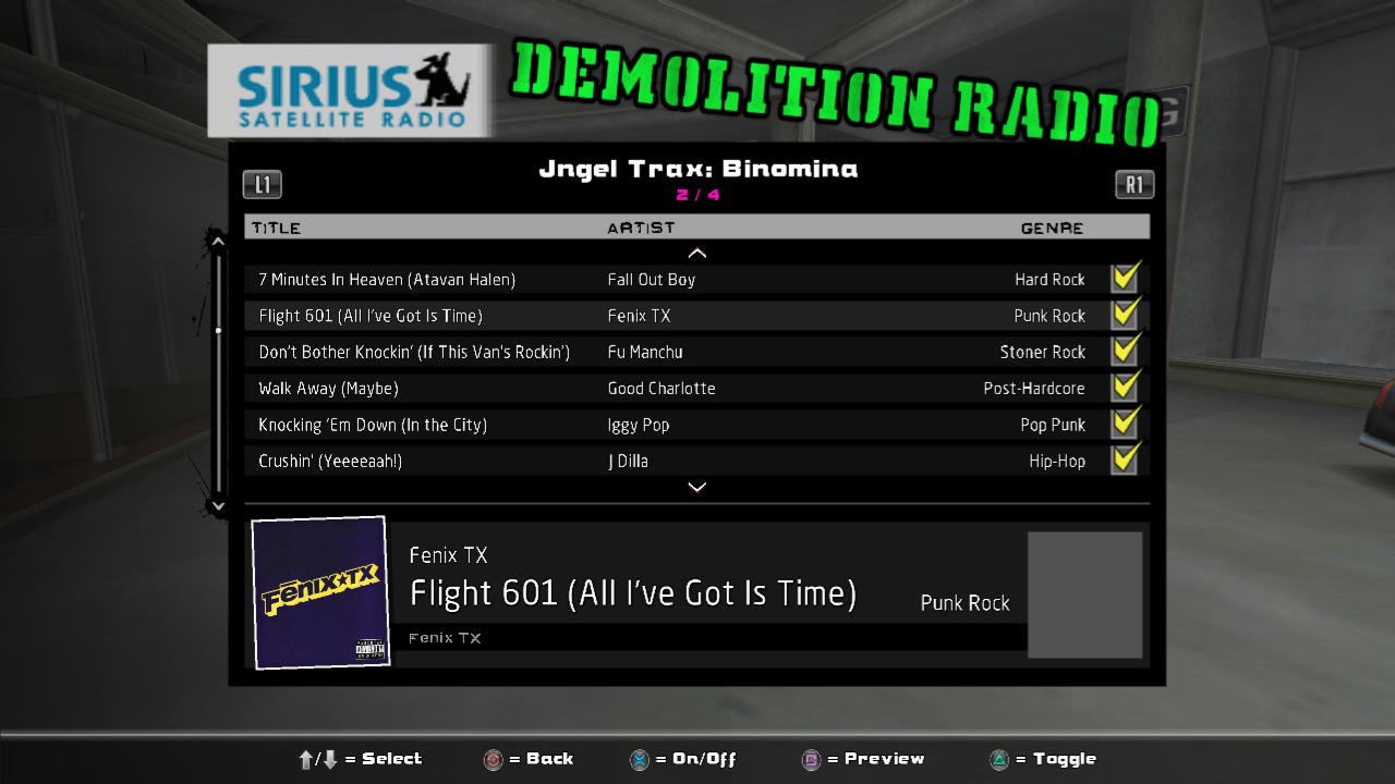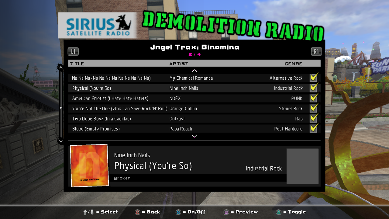 Originally, I was going to call Duplinomina Binomina; that was until I gave myself a brief Latin crash course with a translator. And that is when I thought to myself, "if I'm doing title duos, what if I put dual titles in another soundtrack mod?," hence this music pack. Once again, I took to Spotify to find my 32 songs as a base before asking for suggestions. This soundtrack beats any of my other soundtracks in its amount of songs from suggestions by far! Hell, it being 48 tracks long puts it above Kinovox, my former largest soundtrack mod before Binomina. Plus, this soundtrack reintroduces even more artists that have been featured in the Neversoft series.