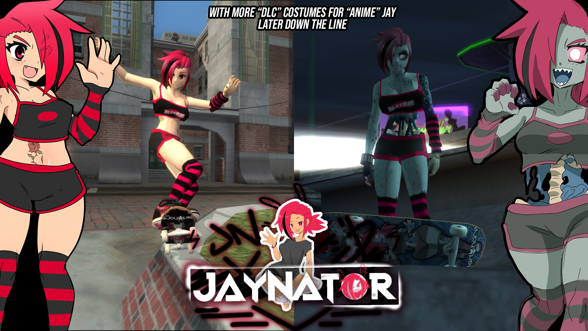 Red Headed, Chill, and ready to Take some Tours. Jacelle is the Mascot of JayNator and has gone through many a design over the years, and ive now expanded into several more designs based off of the THPS Series as a whole, Alongside new Retro Style Decks by Hell Hare Skateboards, and several Tags, As well as including a Version of Jacelle Completely based off her Anime Design she is normally drawn with that will be expanded on as DLC Outfit Packs will come out specifically for Anime Jay over time