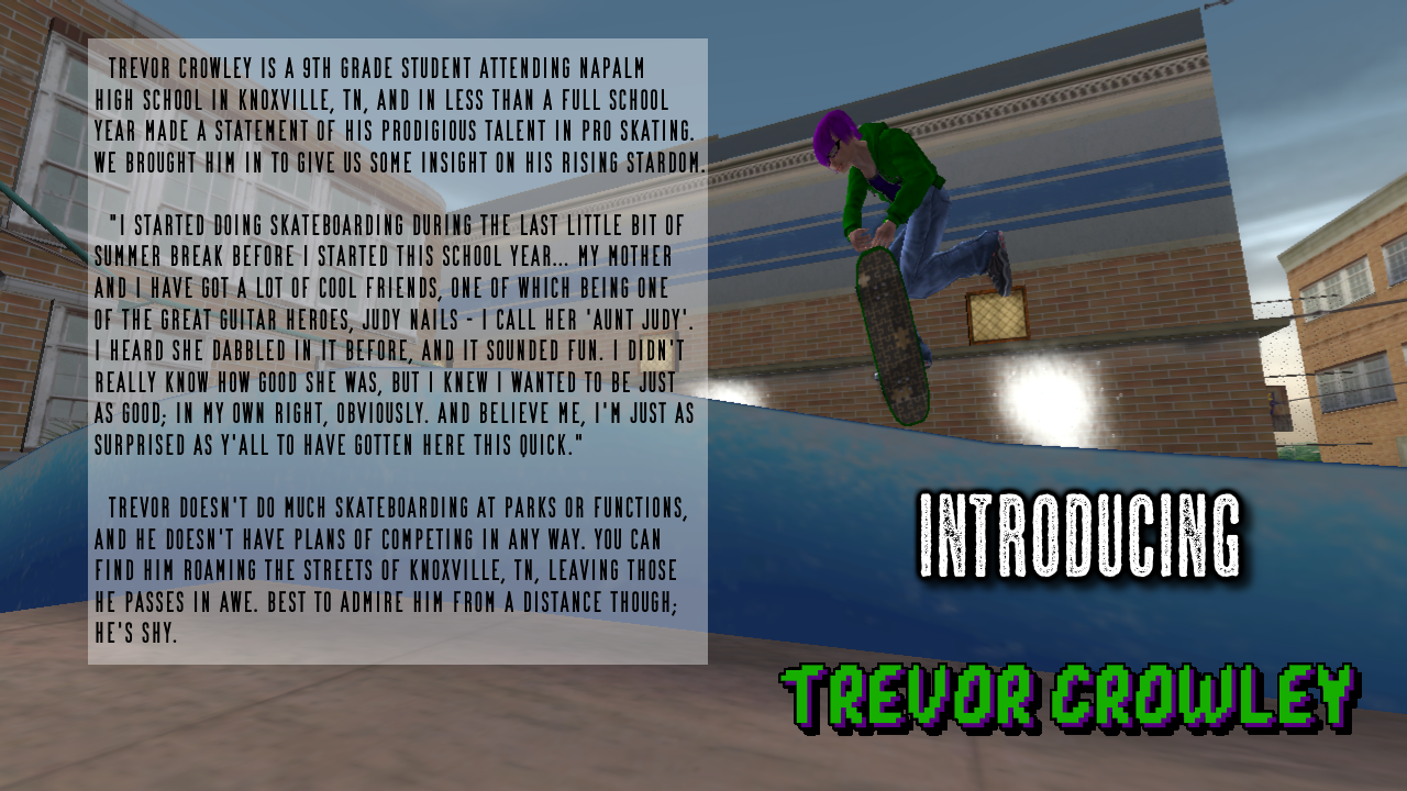 Trevor Crowley is known today as a prodigal Bass Hero - under the watch of his adopted mother Shirley Crowley - and the founding member of his rock band, Show Geckos. Before this was his commitment, he gained a following from Pro Skating, which started out as a hobby in his aunt Judy's backyard, but quickly became his natural talent. He made a front-page feature and had his own dedicated page in the first American Wasteland magazine issue he was a part of.