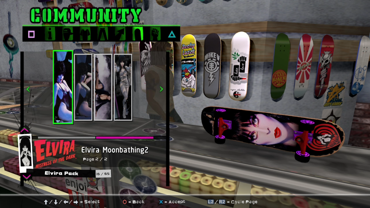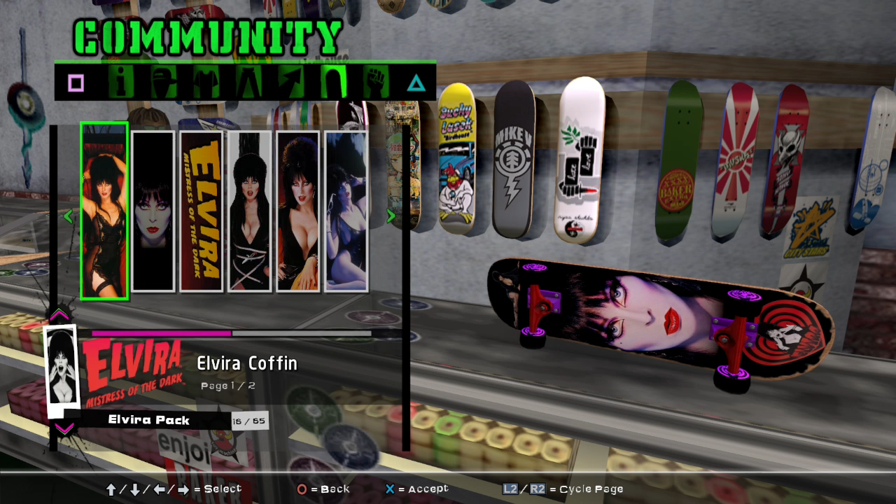 I wanted to add some items for the Elvira skater added by Lakitu (https://thpsgoat.com/mods/item-info?item=2982) Includes -10 Decks -1 Griptape -7 DeckStickers -4 Stickers -3 Tags (uses art from https://www.artstation.com/muttleymark and https://www.artstation.com/sunoborusnd) -2 WheelGraphics This is my first upload, hope you like it.