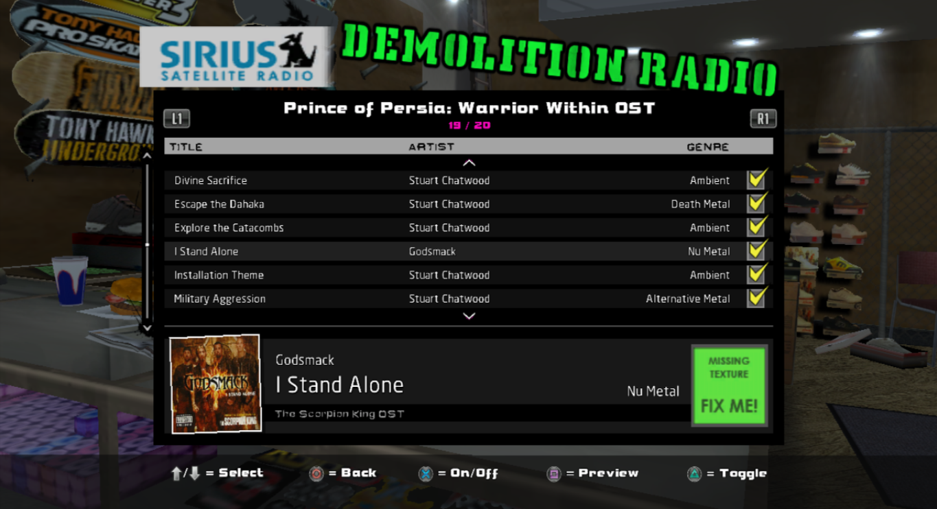 Installed soundtracks will appear in the Demolition Radio menu of the Music Options menu.