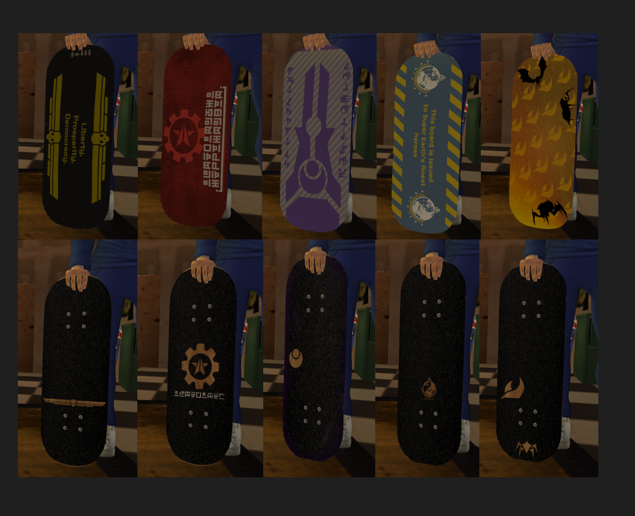 "Illuminate Cult" and "Super earths finest" board designs done by Onepintdrunk, the rest were done by me.
